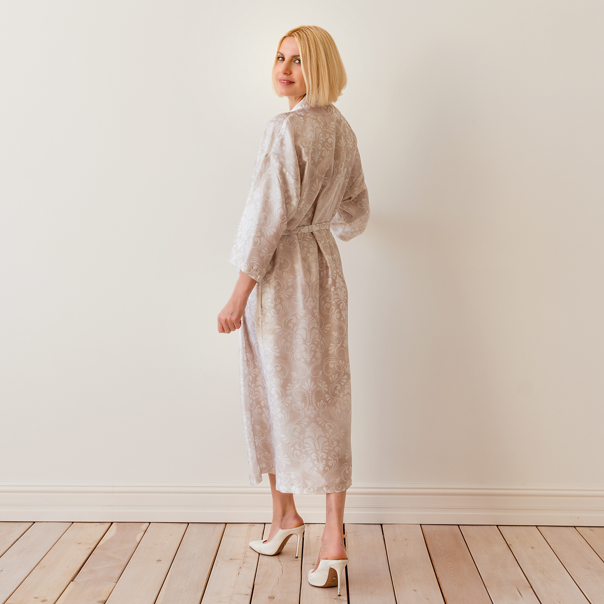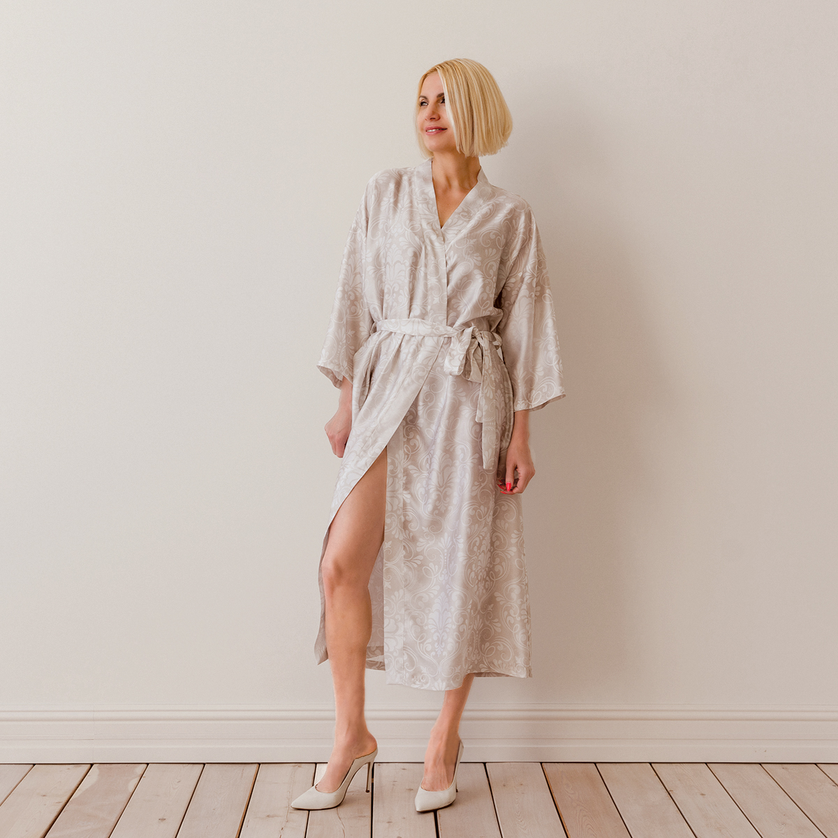 Модель: халат-кимоно, завязывается поясом на запах, имеет внутренние завязки и карманы в швах