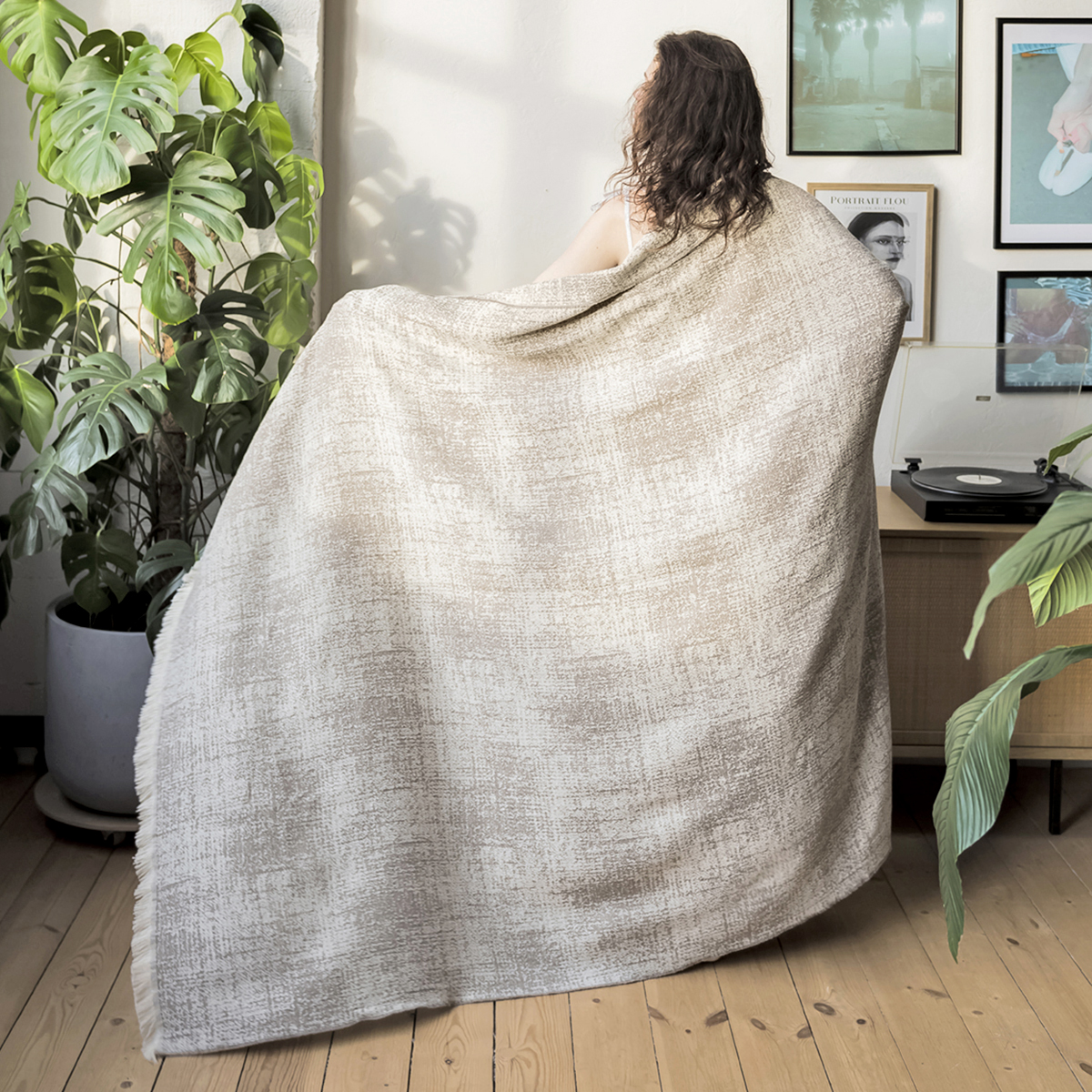 Размер: 135*190см, оформлен бахромой с 2х сторон