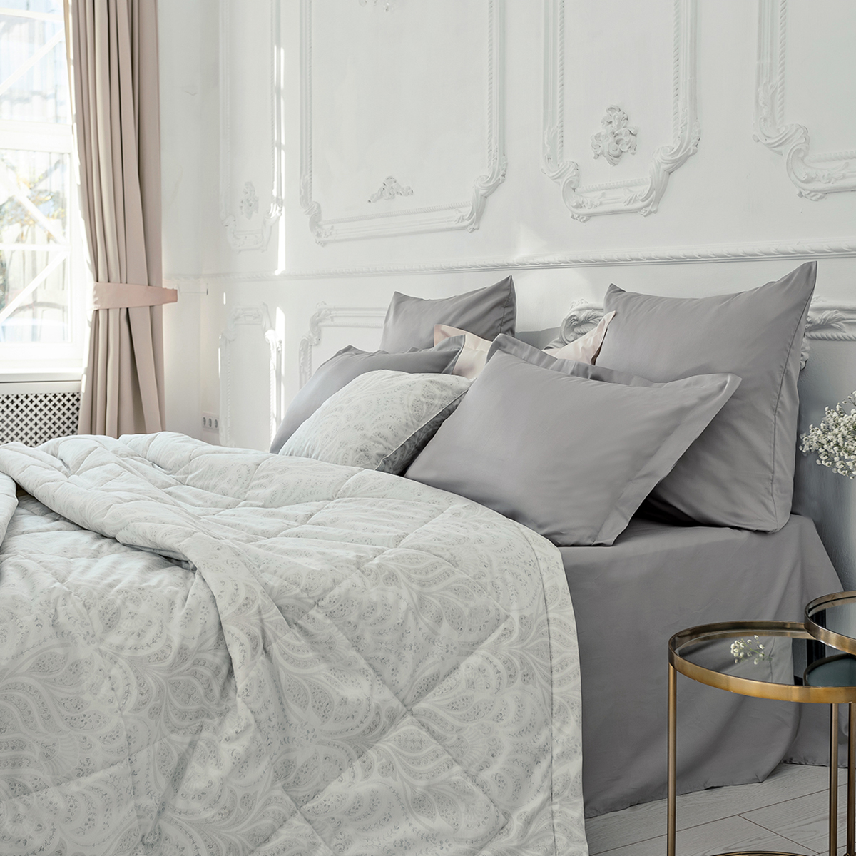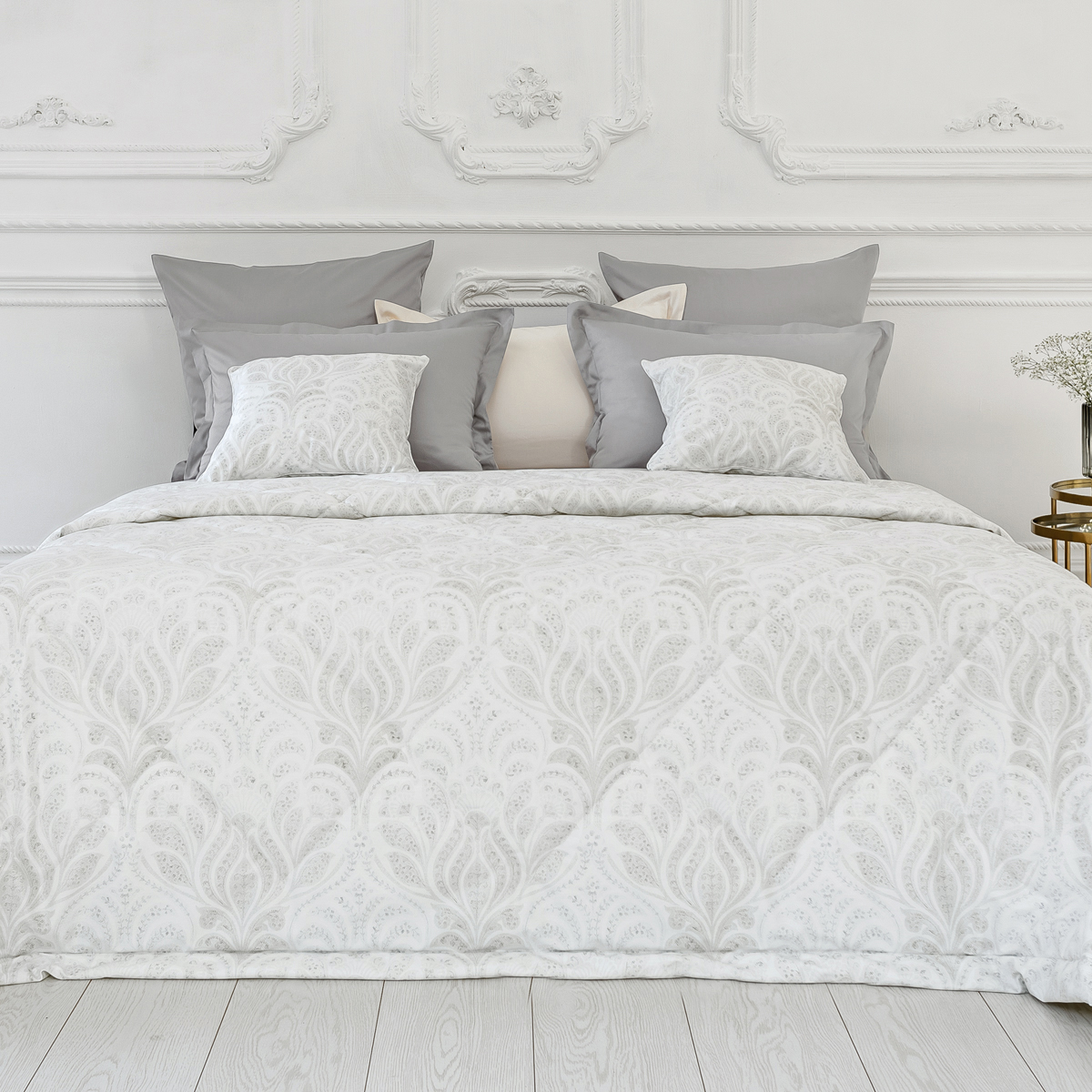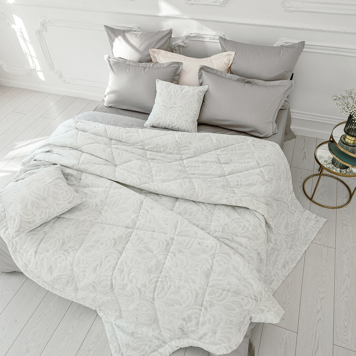 «Франческа» - покрывало с утонченным узором станет отличным выбором для любителей сдержанной элегантности. Легкие линии и деликатные формы, выполненные в пастельных оттенках серого и белого, создают атмосферу уюта и спокойствия. Нежный орнамент, словно сотканный из тончайших нитей, напоминает легкое дыхание природы, придавая интерьеру утонченность и гармонию.