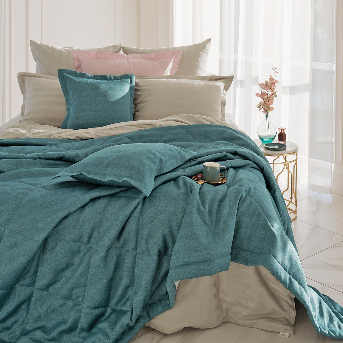 За покрывалом очень легко ухаживать, его можно стирать в домашних условиях при температуре 30С. Покрывало на кровать отлично держит форму и не дает усадку.