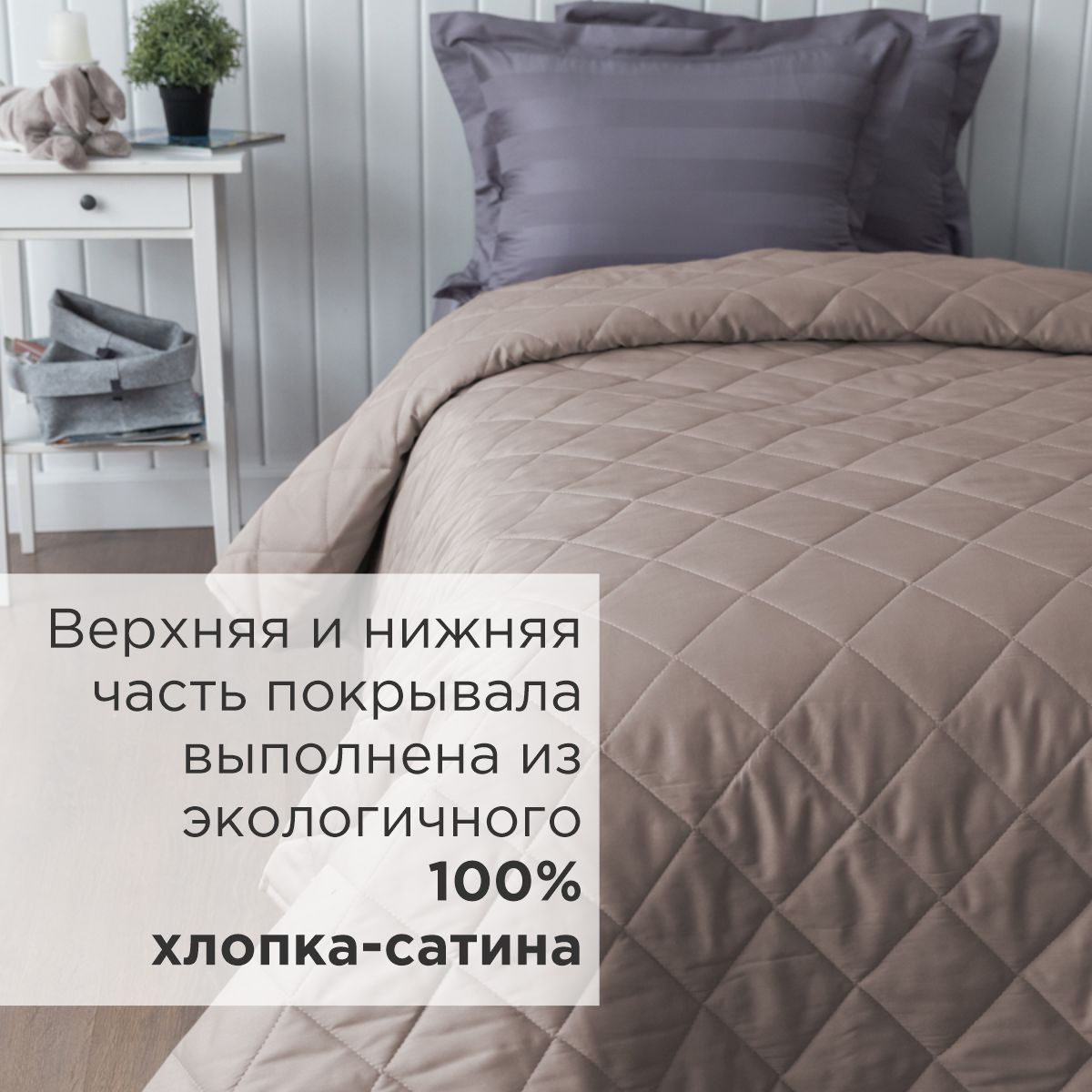 - Верхняя и нижняя часть покрывала выполнены из высококачественного сатина – безопасного, натурального и комфортного материала.