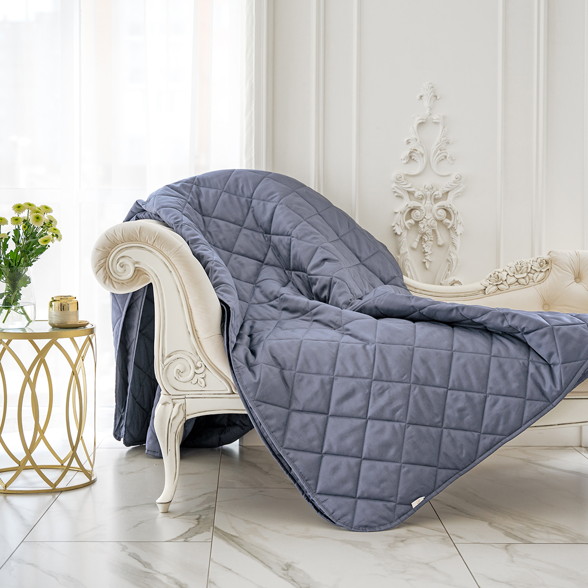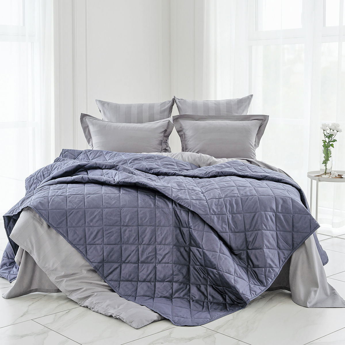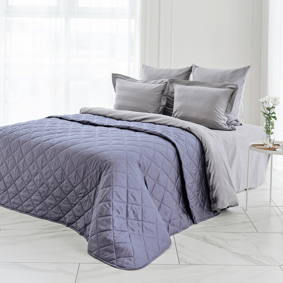 Стеганое покрывало многофункционально: его можно использовать как покрывало для декорирования кровати, так и как легкое одеяло. Покрывало простегано тонким слоем гипоаллергенного наполнителя.