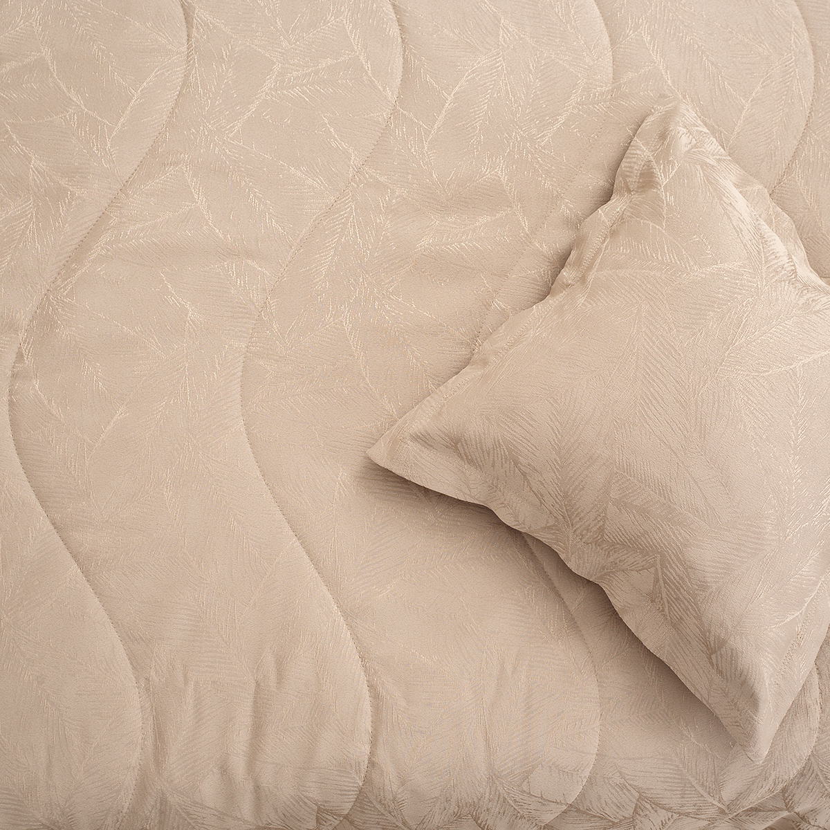 В комплект входит: стеганное покрывало на подкладе размер 240*260 см и 2 декоративные наволочки 45х45 см на молнии. Наволочки с четырех сторон декорированы ушками шириной 4 см.
