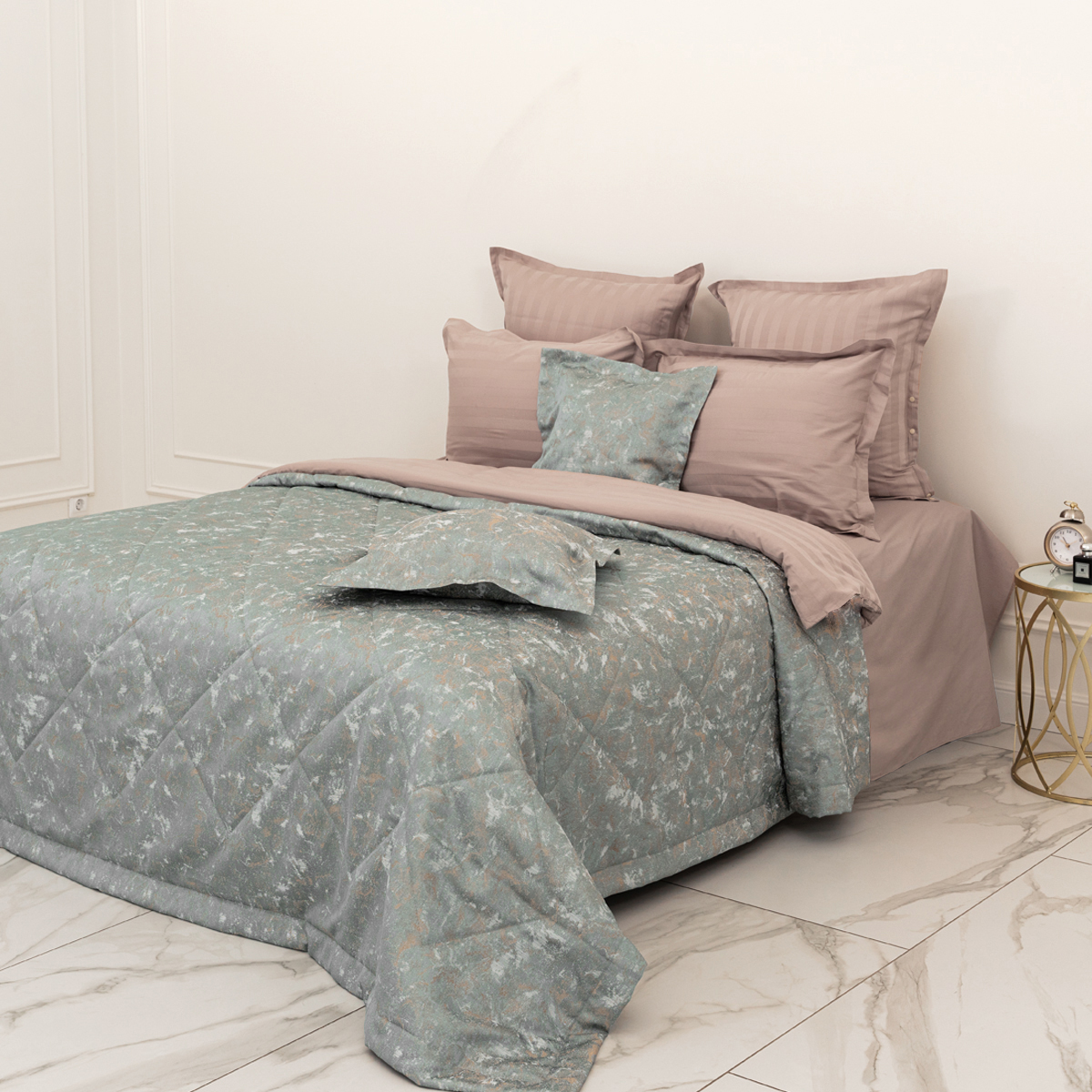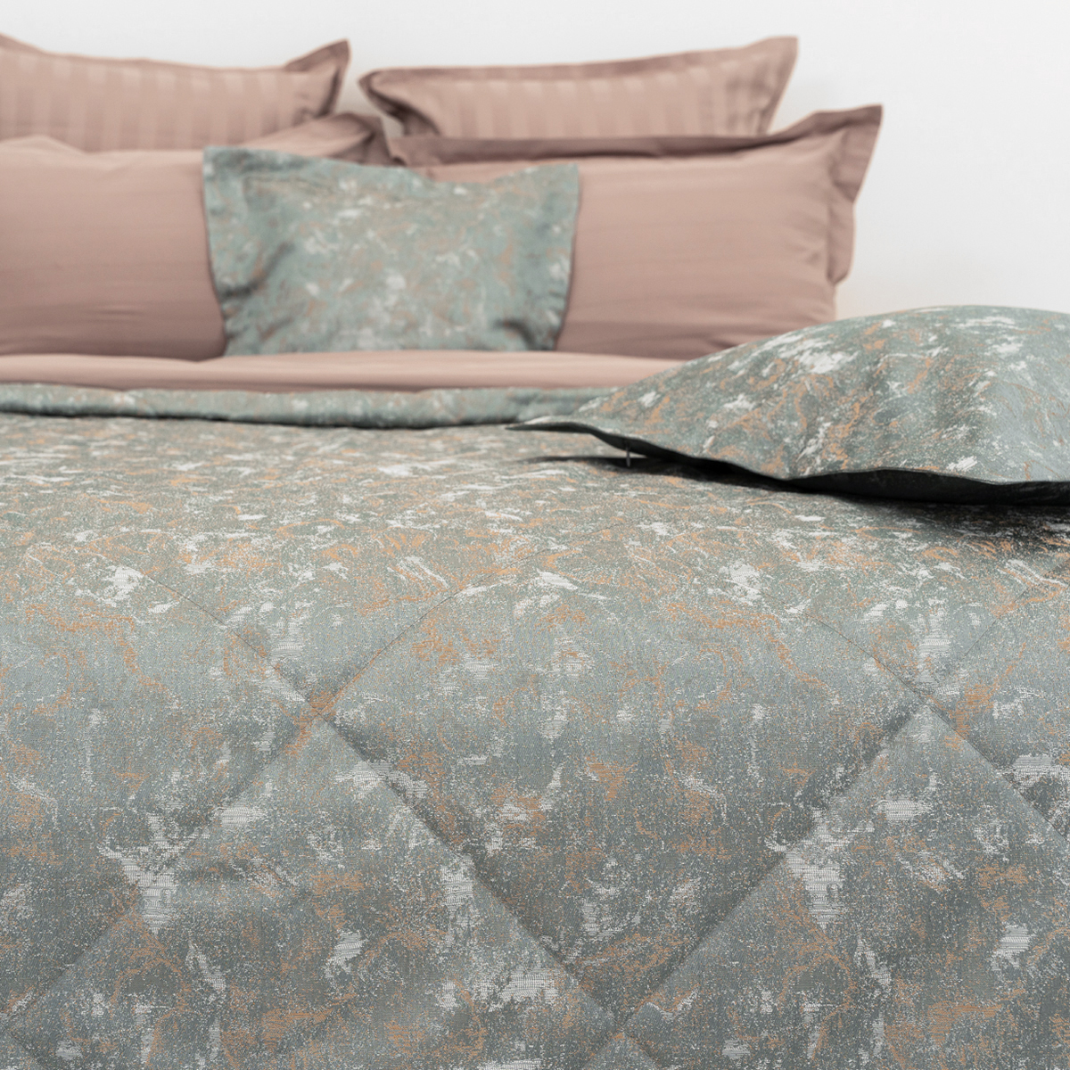 Состав: ткань портьерная жаккард 100% пэ, наполнитель - полиэфирное волокно. Стежка в виде ромбов. Подклад покрывала – микрофибра велюр, за счет своей фактуры он предотвращает скольжение покрывала на кровати.