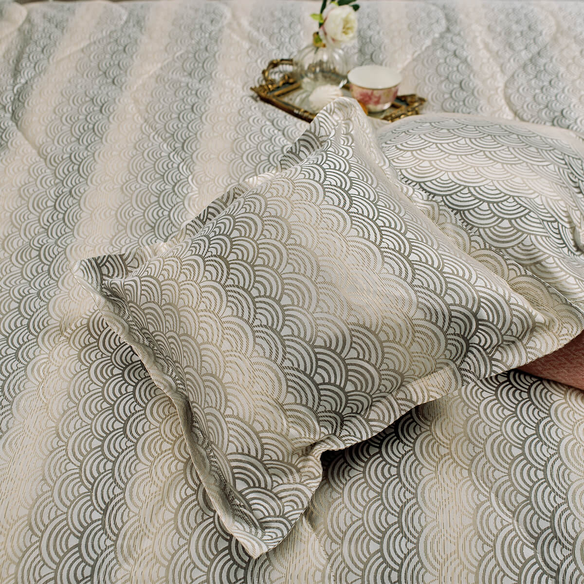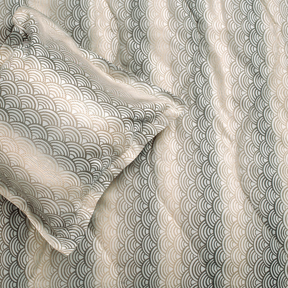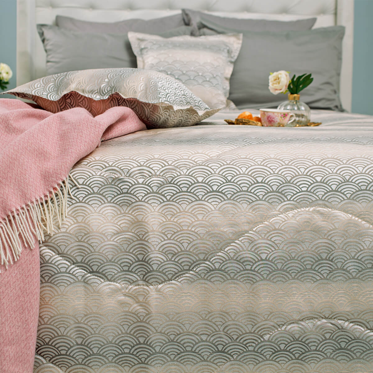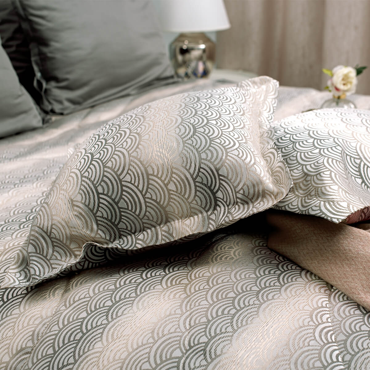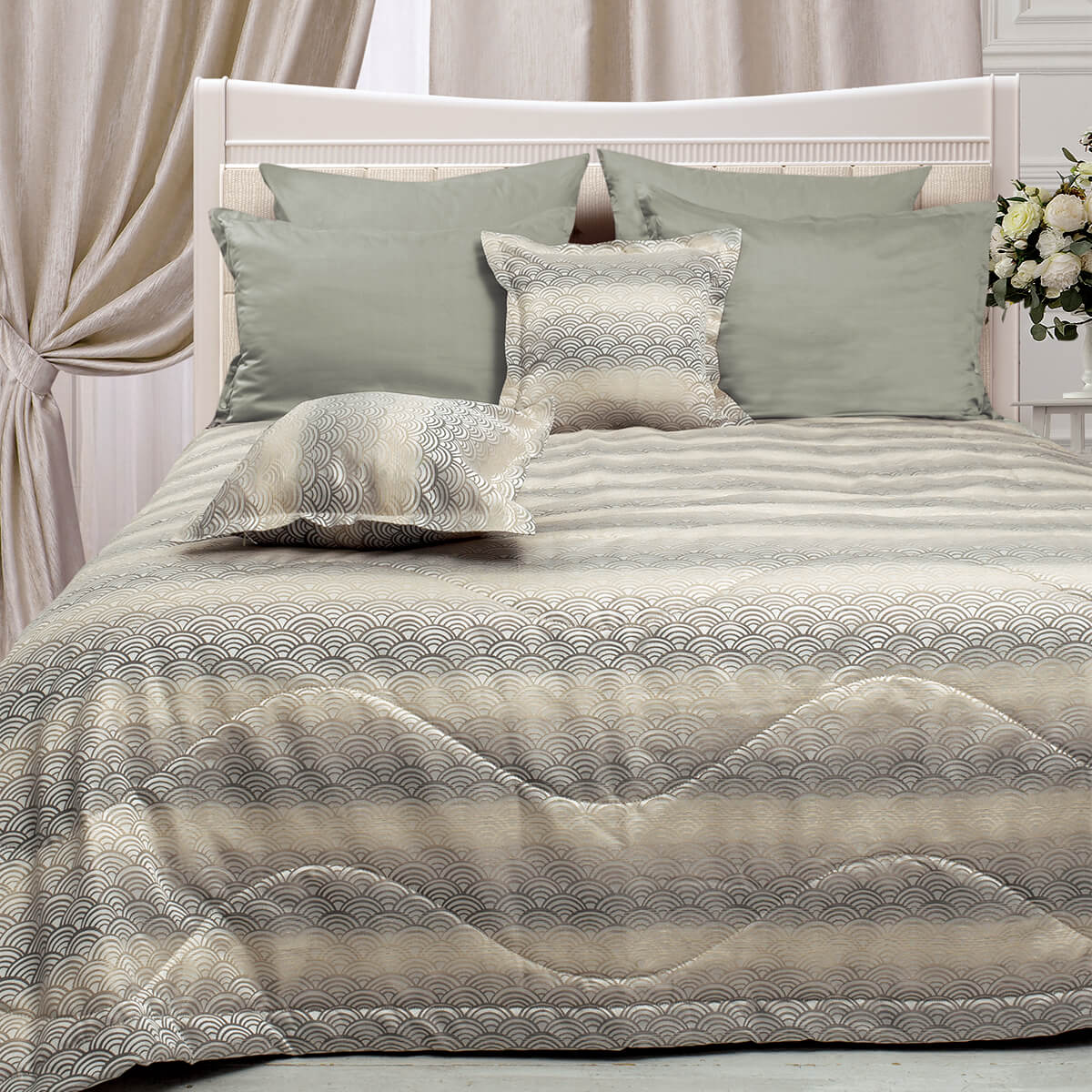 Коллекцию отличает оригинальный и необычный орнамент, он придает пространству спальни особую легкость, стильно дополняет интерьер и придает ему индивидуальность. Особый шик коллекции придает элегантный переход цвета.