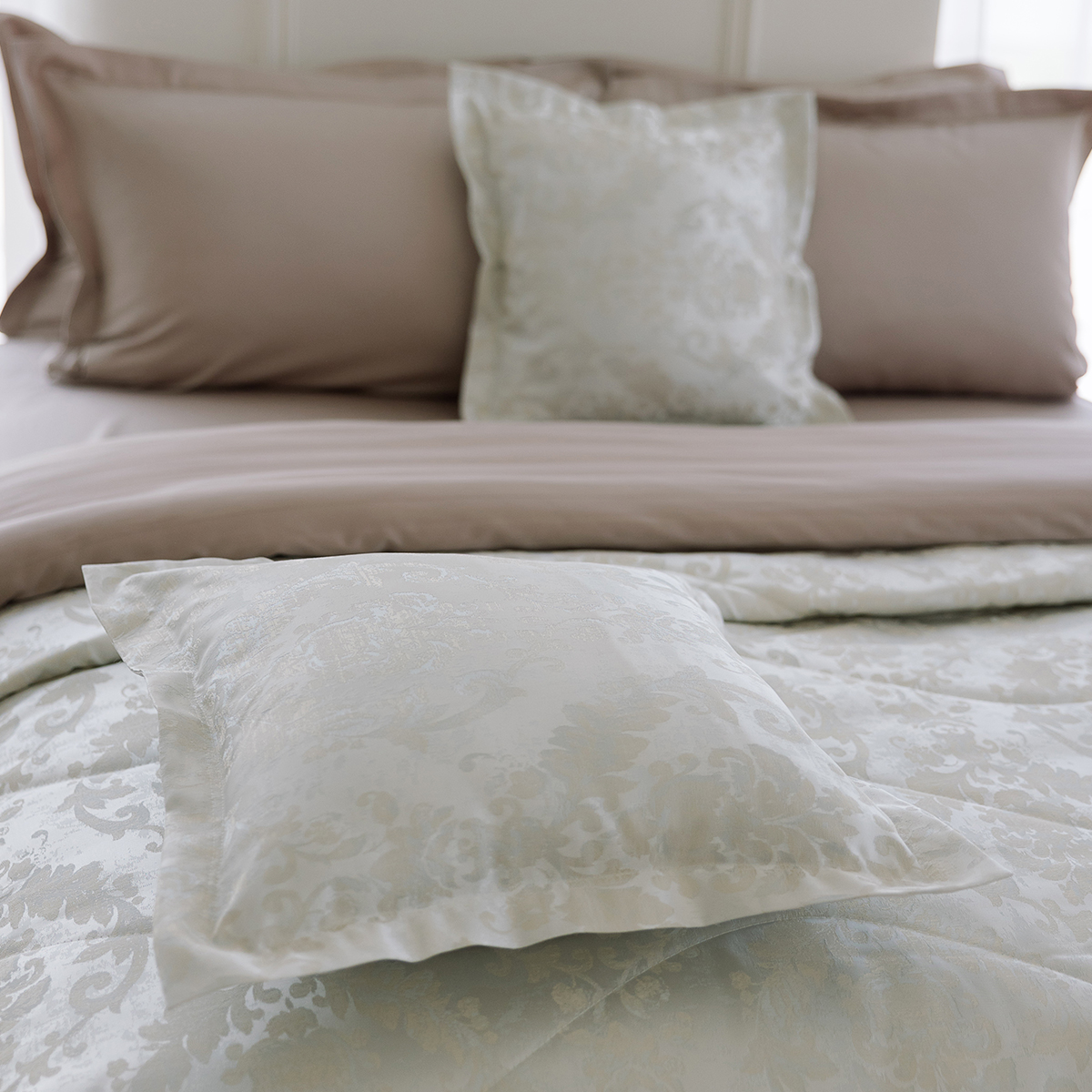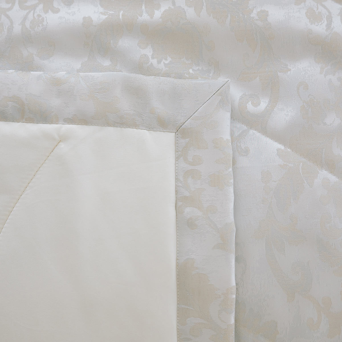 В комплект входит: стеганое покрывало на подкладе размер 240х260 см и 2 декоративные наволочки 45х45 см на молнии. Наволочки с четырех сторон декорированы ушками шириной 4 см.
