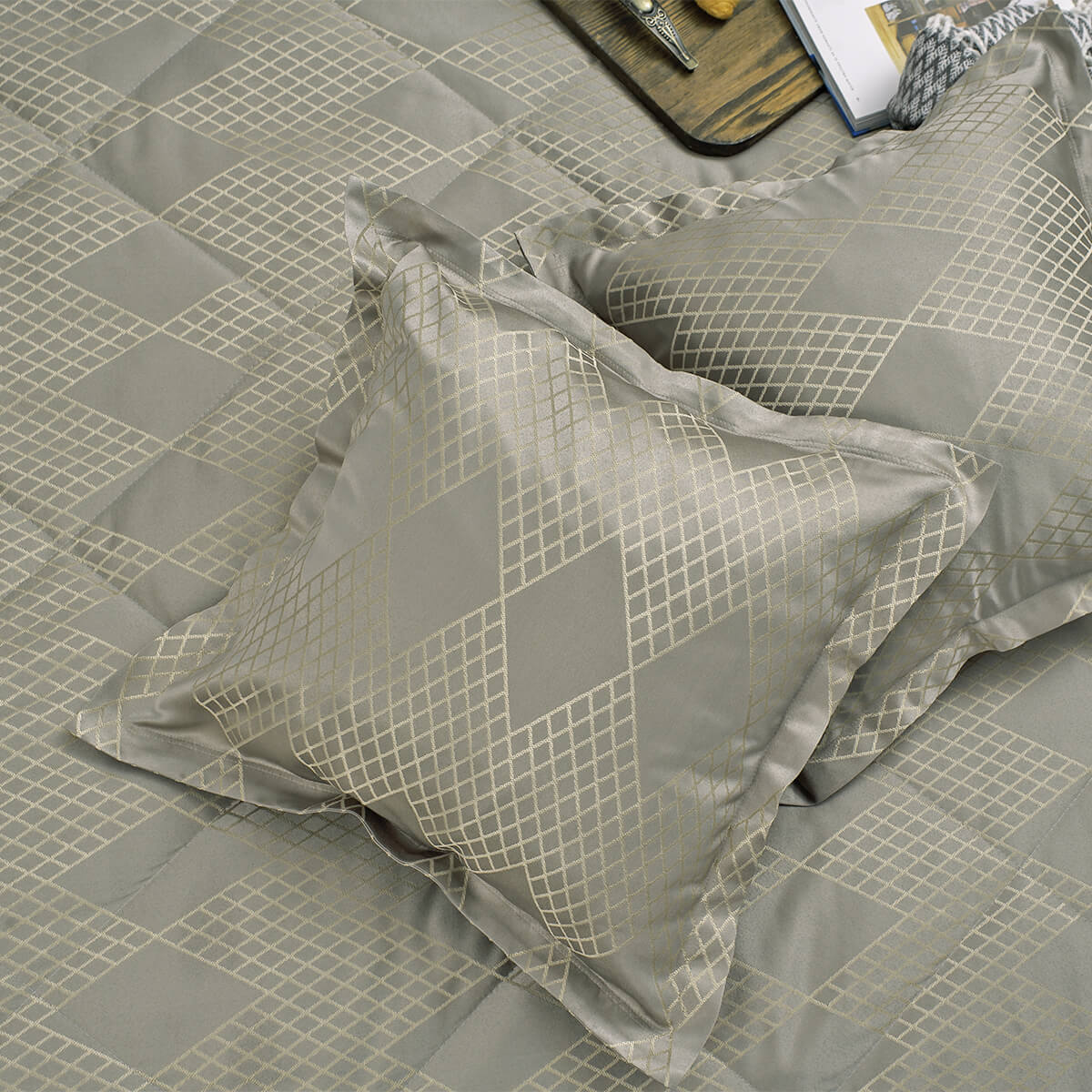 В комплект входит: стеганное покрывало на подкладе размер 240*260 см и 2 декоративные наволочки 45х45 см на молнии. Наволочки с четырех сторон декорированы ушками шириной 4 см.