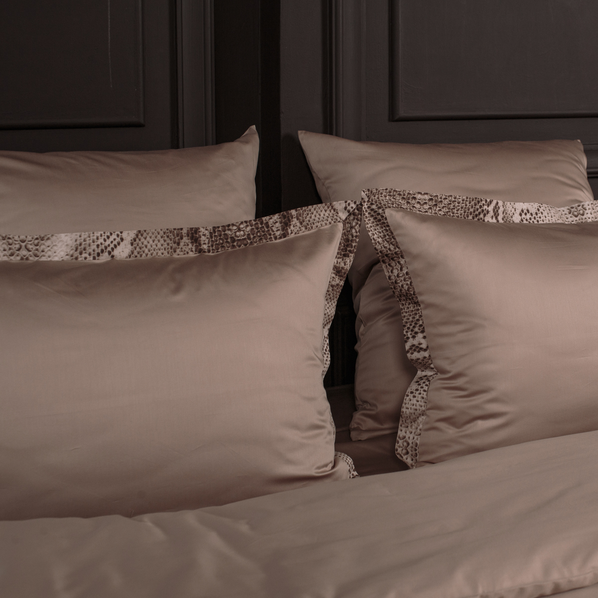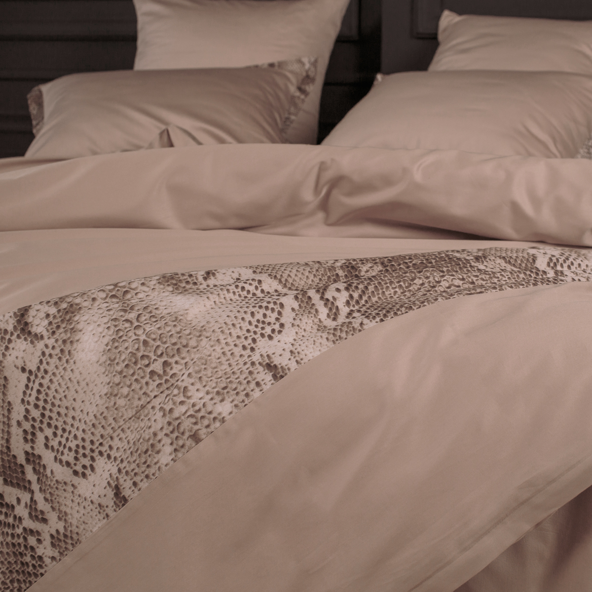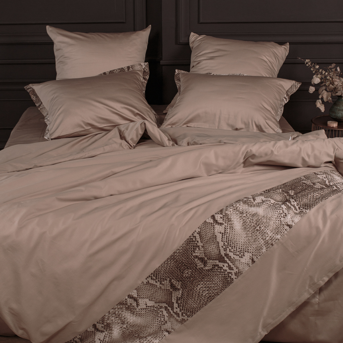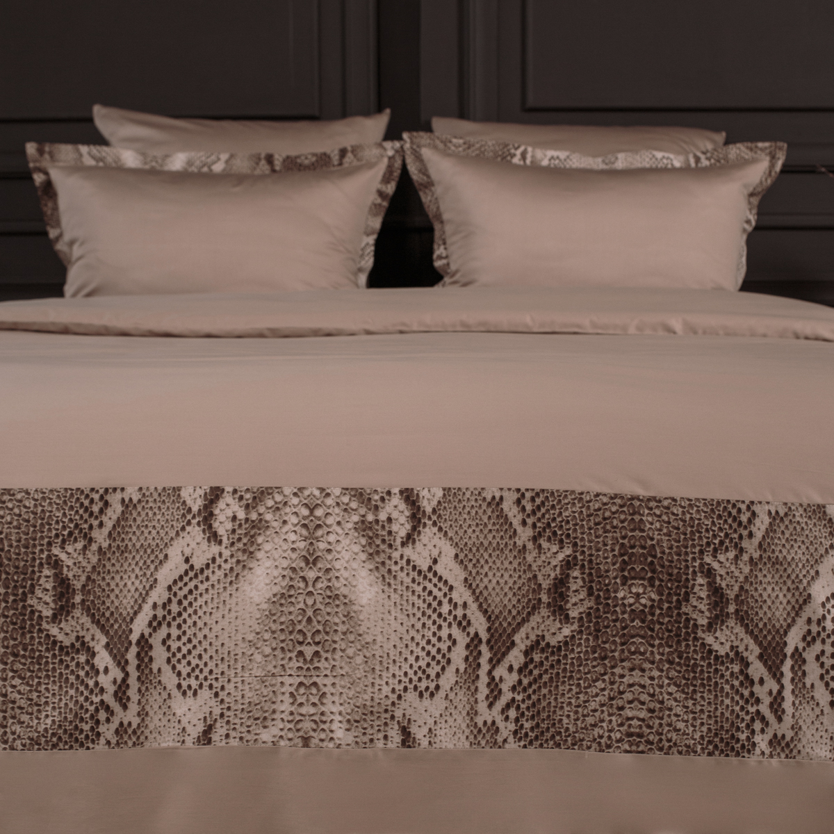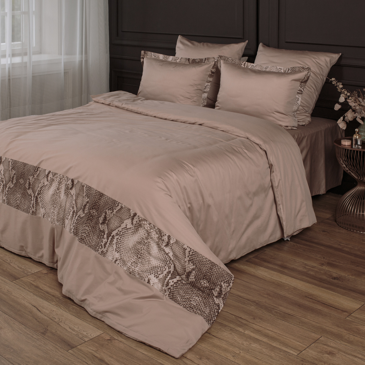 Основа дизайна - универсальный теплый бежевый оттенок стильно дополнен изящными деталями с чувственным и дерзким принтом рептилии. Джорджия создает атмосферный акцент в пространстве спальни, делает интерьер смелее и разнообразнее.