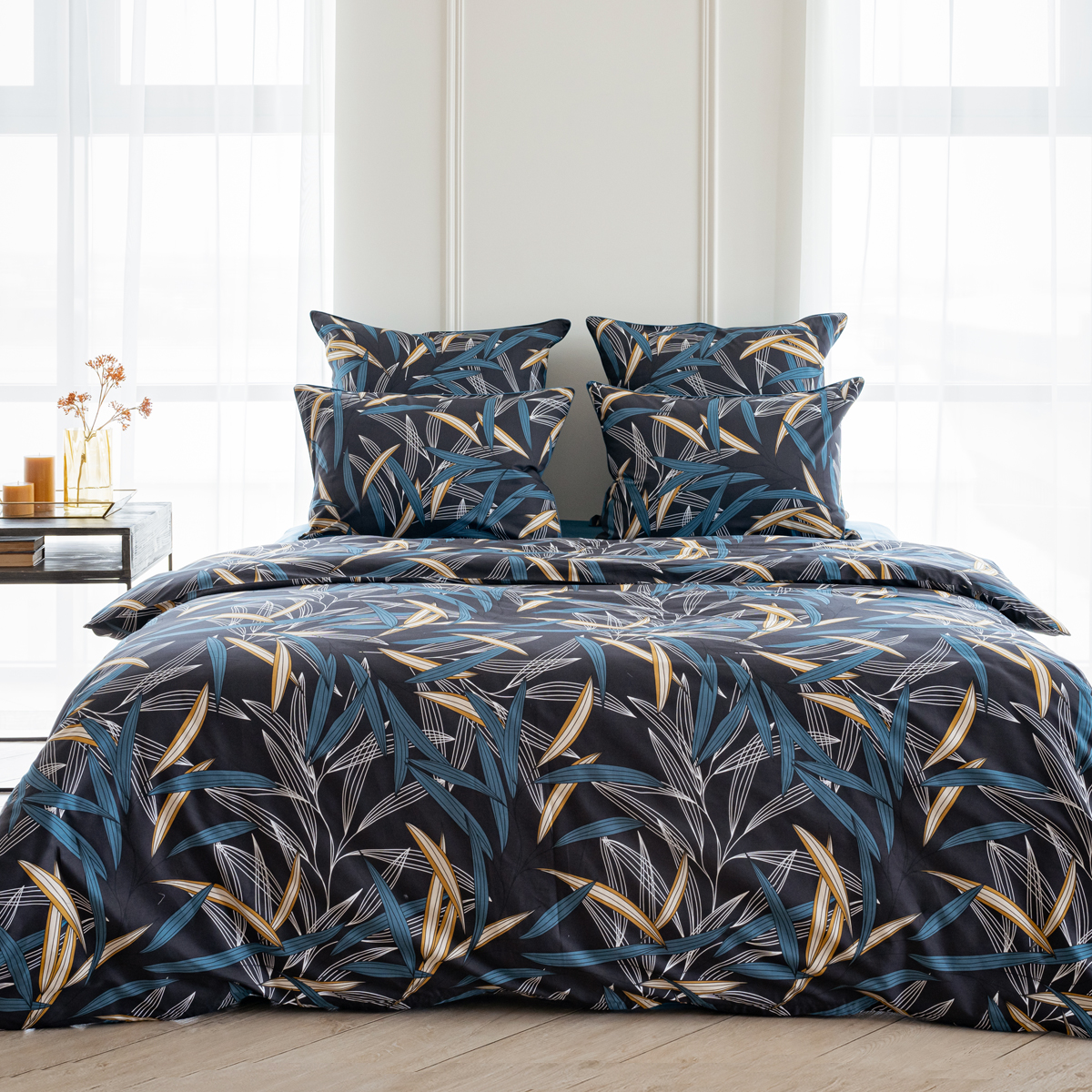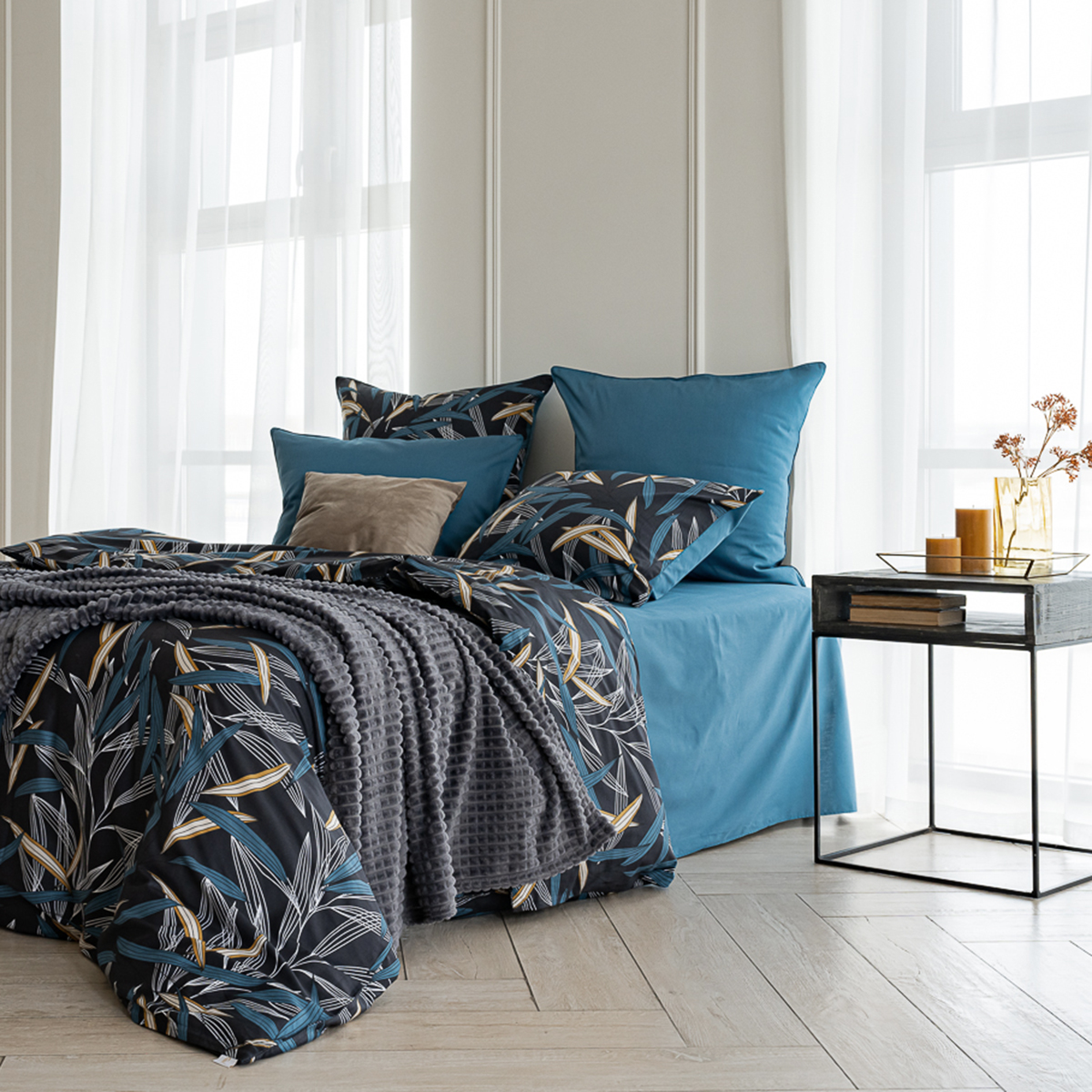 - Наволочки двухсторонние: лицевая сторона– растительный принт, оборотная – однотонная. Декоративный кант по трем сторонам наволочки.