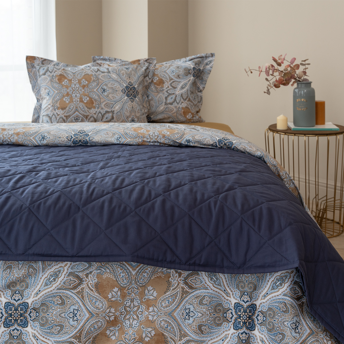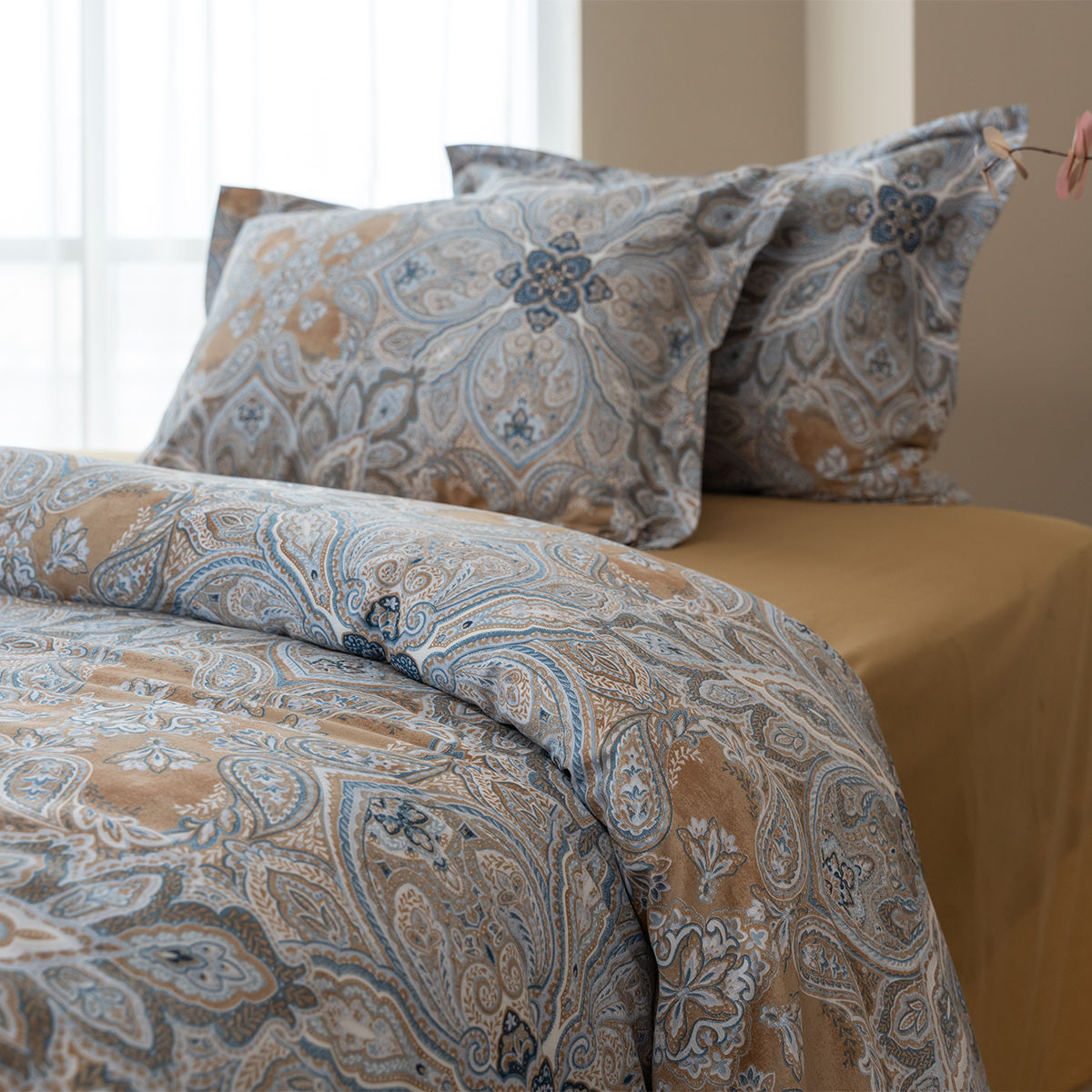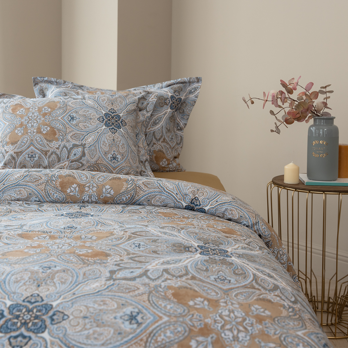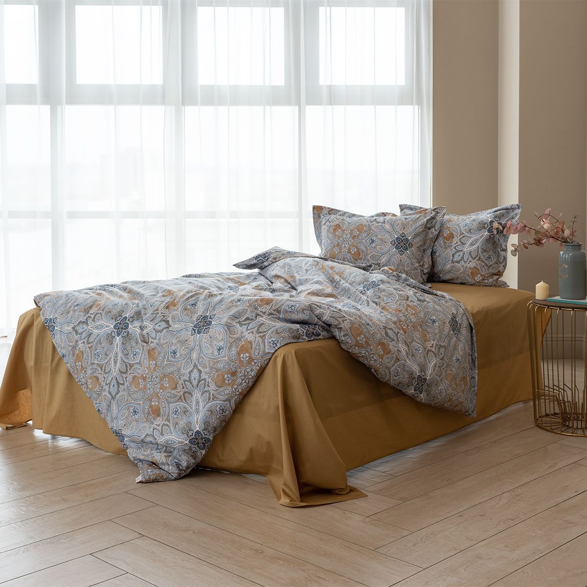 Завораживающий и манящий восточный орнамент, он всегда актуален. Дизайн стильно подчеркнут универсальной и гармоничной палитрой песочных и серо-голубых оттенков. Эксклюзивные печатные принты созданы в собственной дизайн студии La Prima.