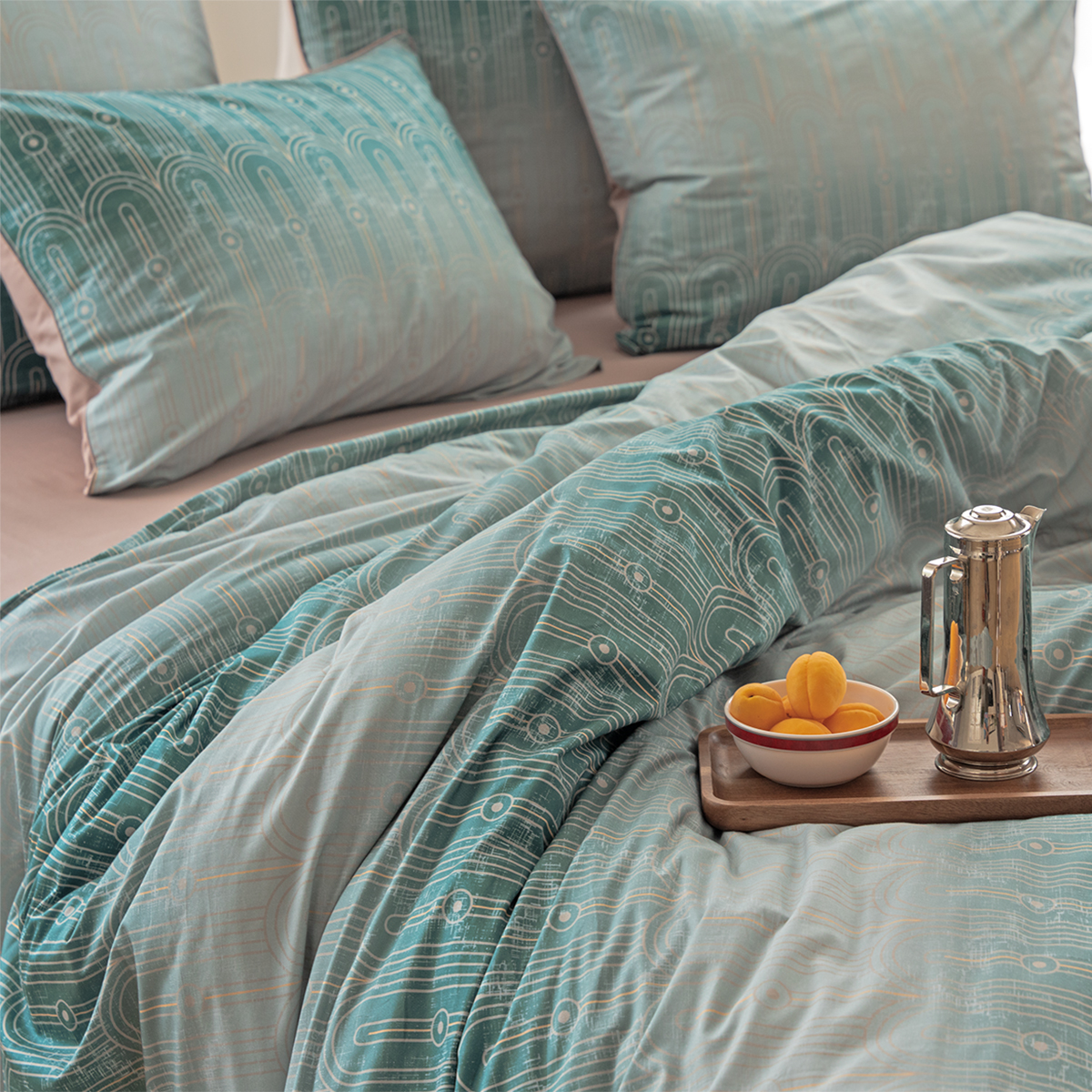 Постельное белье «Массимо» - чарующий градиент от глубокого нефритового оттенка до мягкого бежевого. Изящные линии орнамента напоминают стилизованную решетку итальянских палаццо.