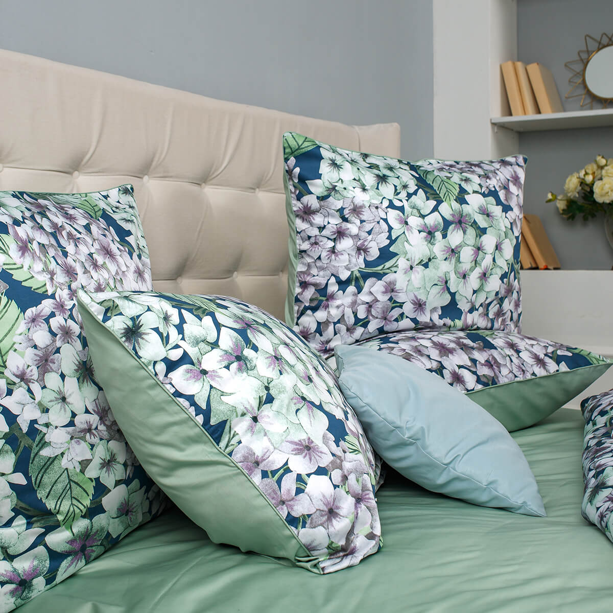 - Наволочки двухсторонние: лицевая сторона – абстракция, оборотная – однотонная. Декоративный кант по трем сторонам наволочки. Широкий запах на наволочках - легко менять подушки.