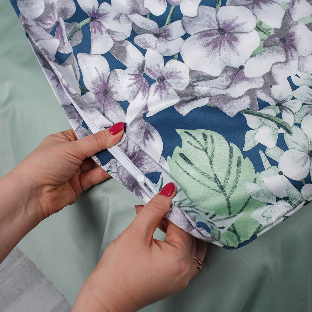 - «Невидимая» молния во всю ширину по нижнему краю пододеяльника. Для быстрой и удобной смены постельного белья в верхней части пододеяльника расположены клапаны для рук. Сменить пододеяльник можно за 30 секунд.