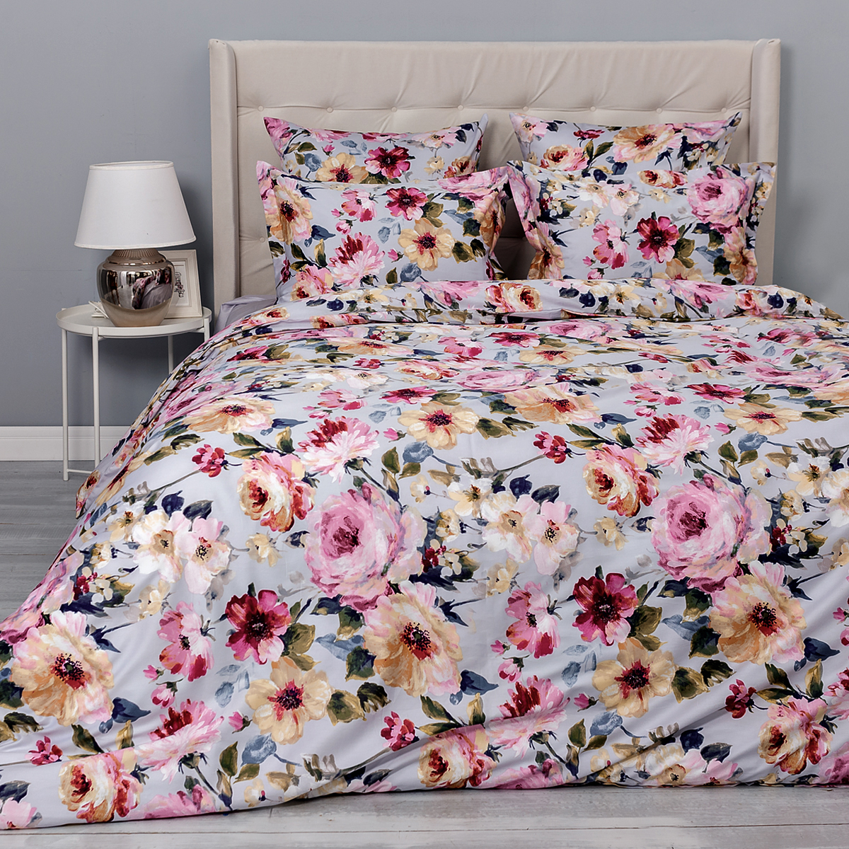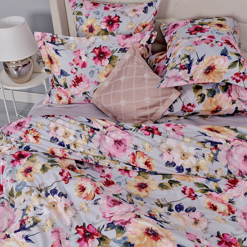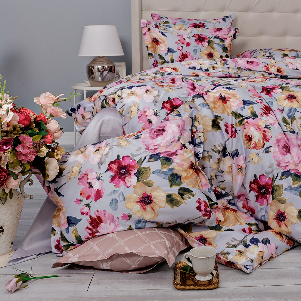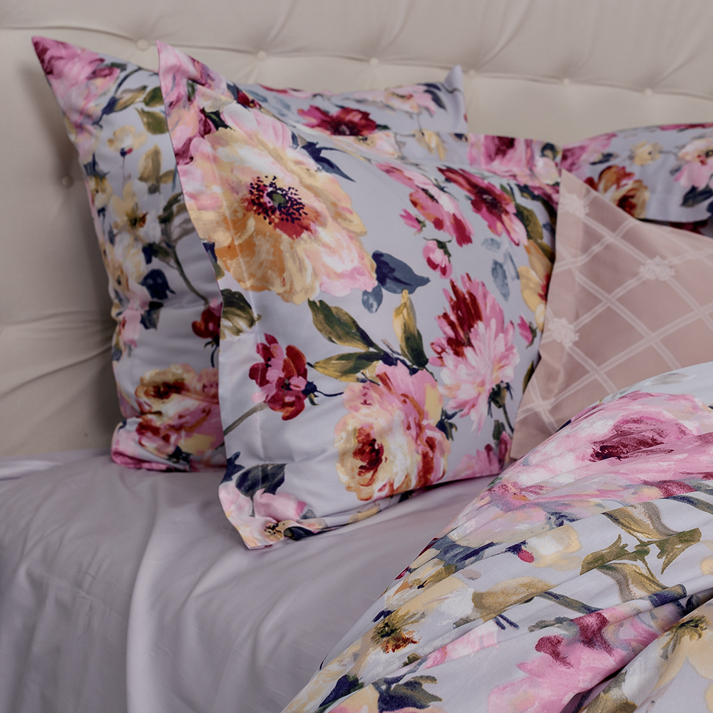 Хрупкие и роскошные, яркие и нежные, акварельные цветы на светлом серо-голубом фоне наполнят спальню изысканностью цветущего сада, создадут атмосферу радостной безмятежности.