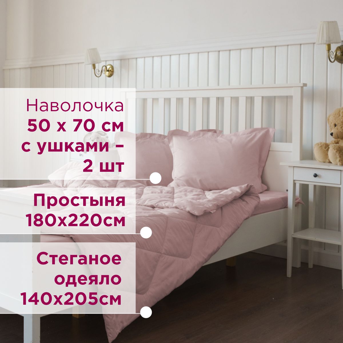 Детали: Наволочка 50х70см - 2 шт, размер одеяла 140 х 205 см. простыня 180 х 220 см.