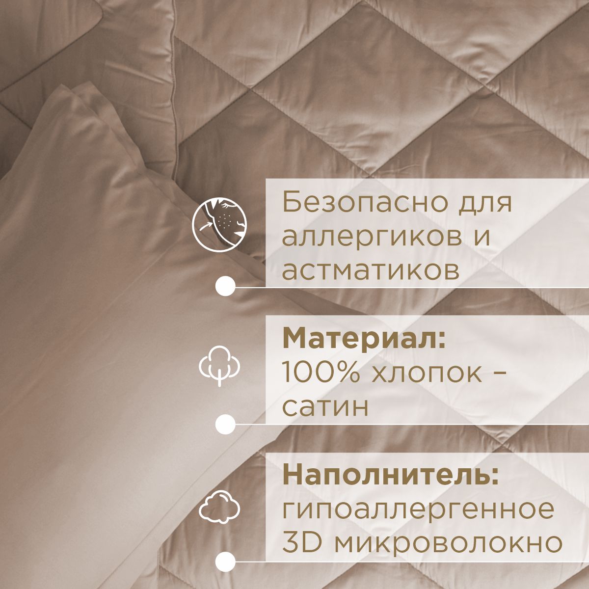 • Стеганое одеяло 140х205см. Одеяло всесезонное, плотность 200гр, что позволяет пользоваться им круглый год. Наполнитель у одеяла: гипоаллергенное 3D микроволокно, не сбивается после стирок.