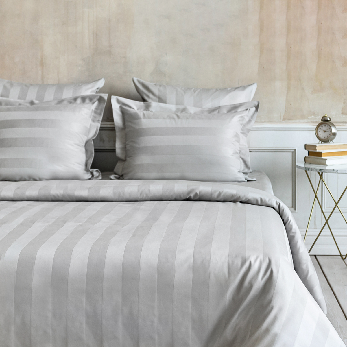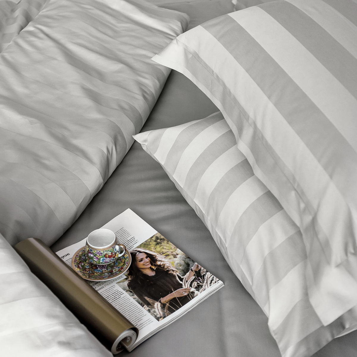 Однотонный комплект постельного белья - роскошный 100% египетский хлопок высшего сорта, с жаккардовым рисунком в виде полос 5х5см. Используется более тонкая 60-я нить. За счет специальной скрутки нити, ткань получается очень мягкая и приятная на ощупь. Имеет благородный блеск.