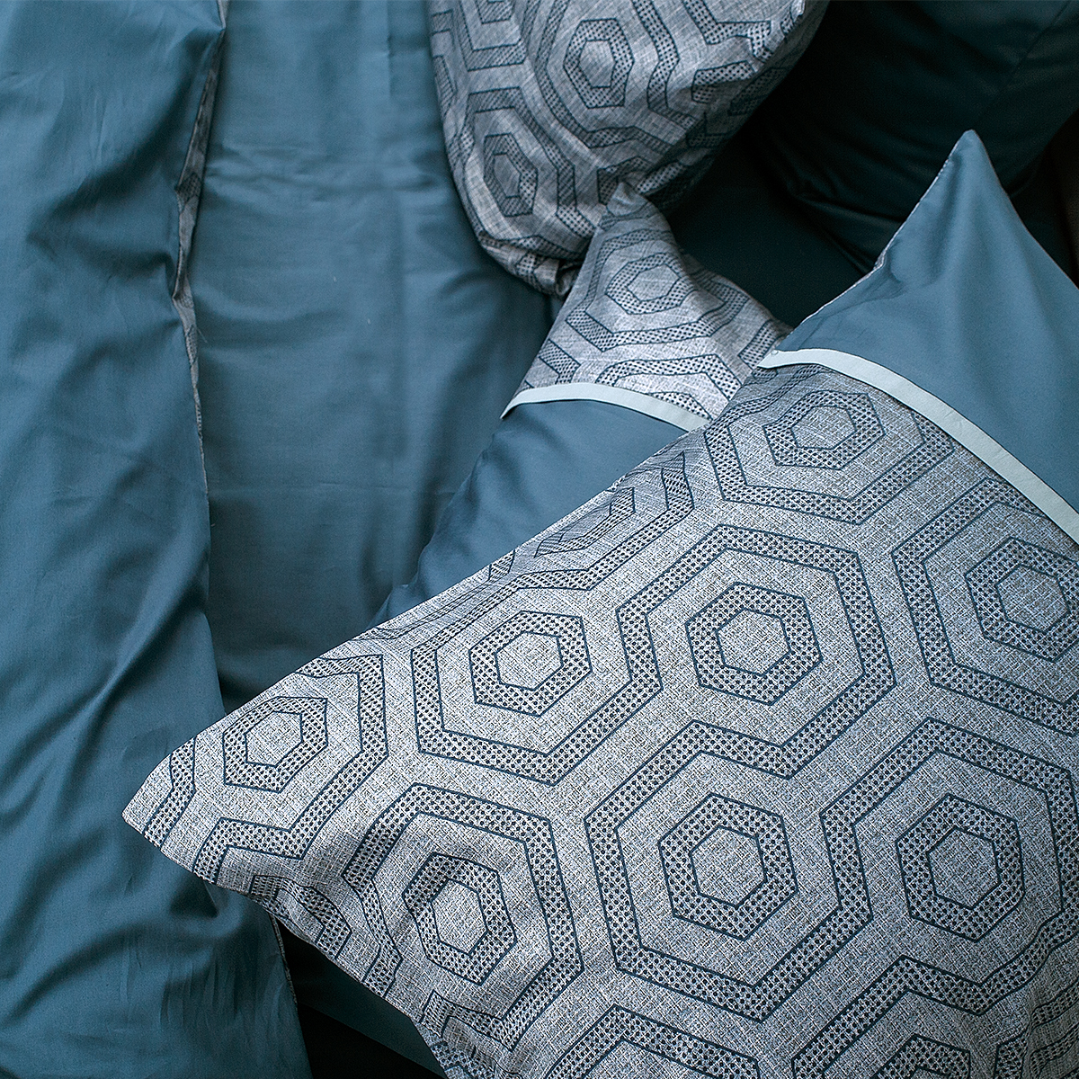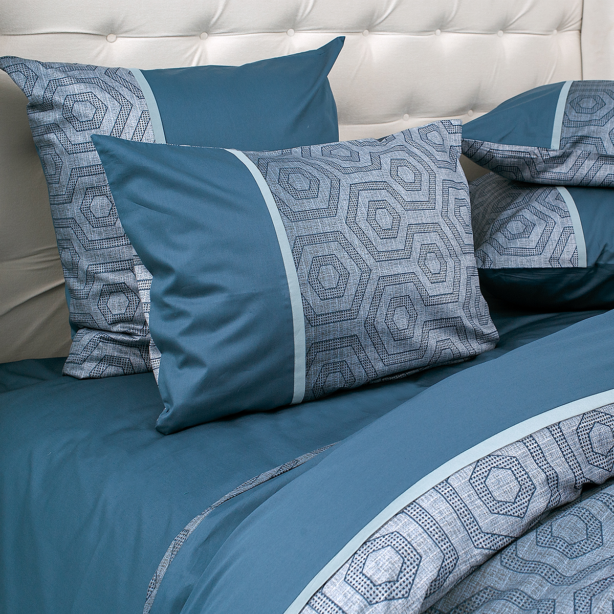 Смелый и дерзкий... Ультрамодная игра сочетаний: стильный геометрический орнамент, замысловатая архитектура ломанных линий и форм удачно подчеркивает стиль и лаконичность современного интерьера. Особую брутальность комплекту придают глубокие и насыщенные лазурно-изумрудные оттенки.