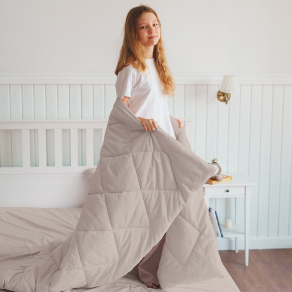 • Стеганое одеяло 140х205см. Одеяло всесезонное, плотность 200гр, что позволяет пользоваться им круглый год. Наполнитель у одеяла: гипоаллергенное 3D микроволокно, не сбивается после стирок.