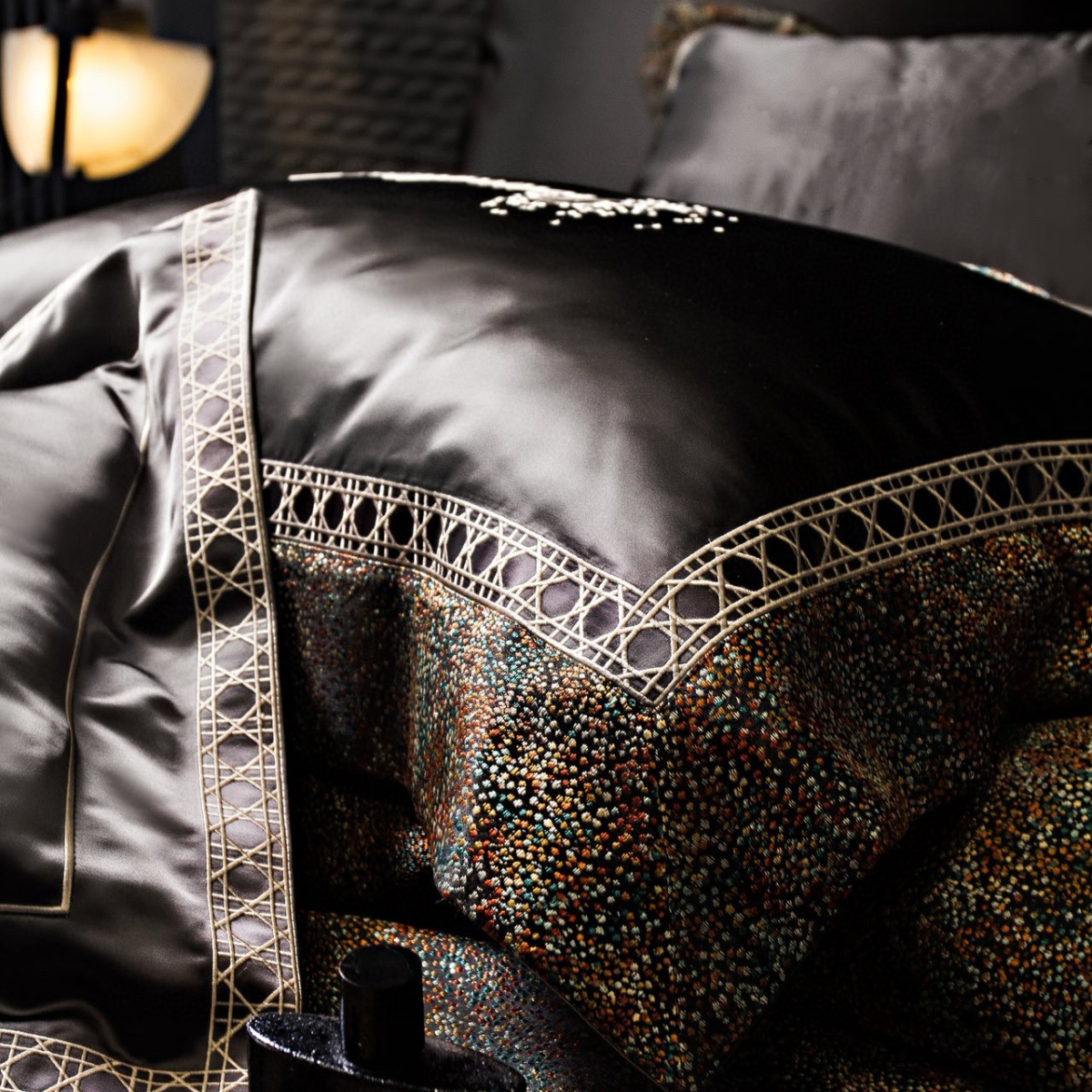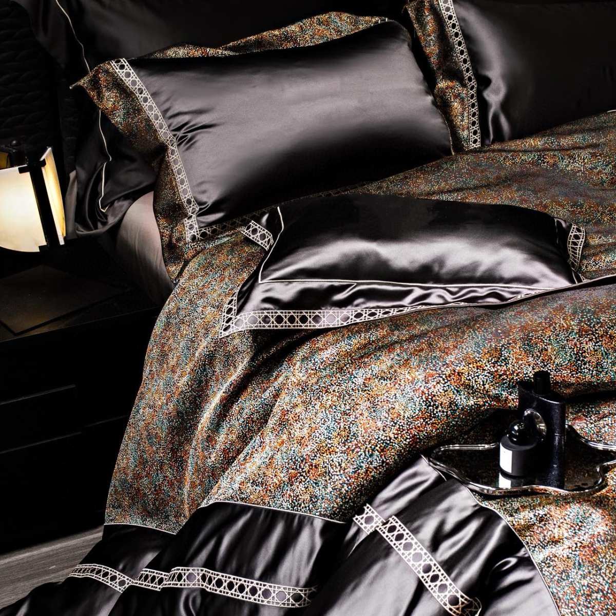 Особое внимание уделено дизайну. Эксклюзивный дизайн, разработанный в Дом Моды «Аника Керимова», подчёркивает неповторимость серии «Орелио». Мозаичный принт с разноцветными вкраплениями и ажурный кант с геометрическим узором стали акцентом коллекции и символом аристократичной изысканности. Благодаря двустороннему исполнению комплект легко меняет атмосферу спальни — от утончённой гармонии до выразительной декоративности.
