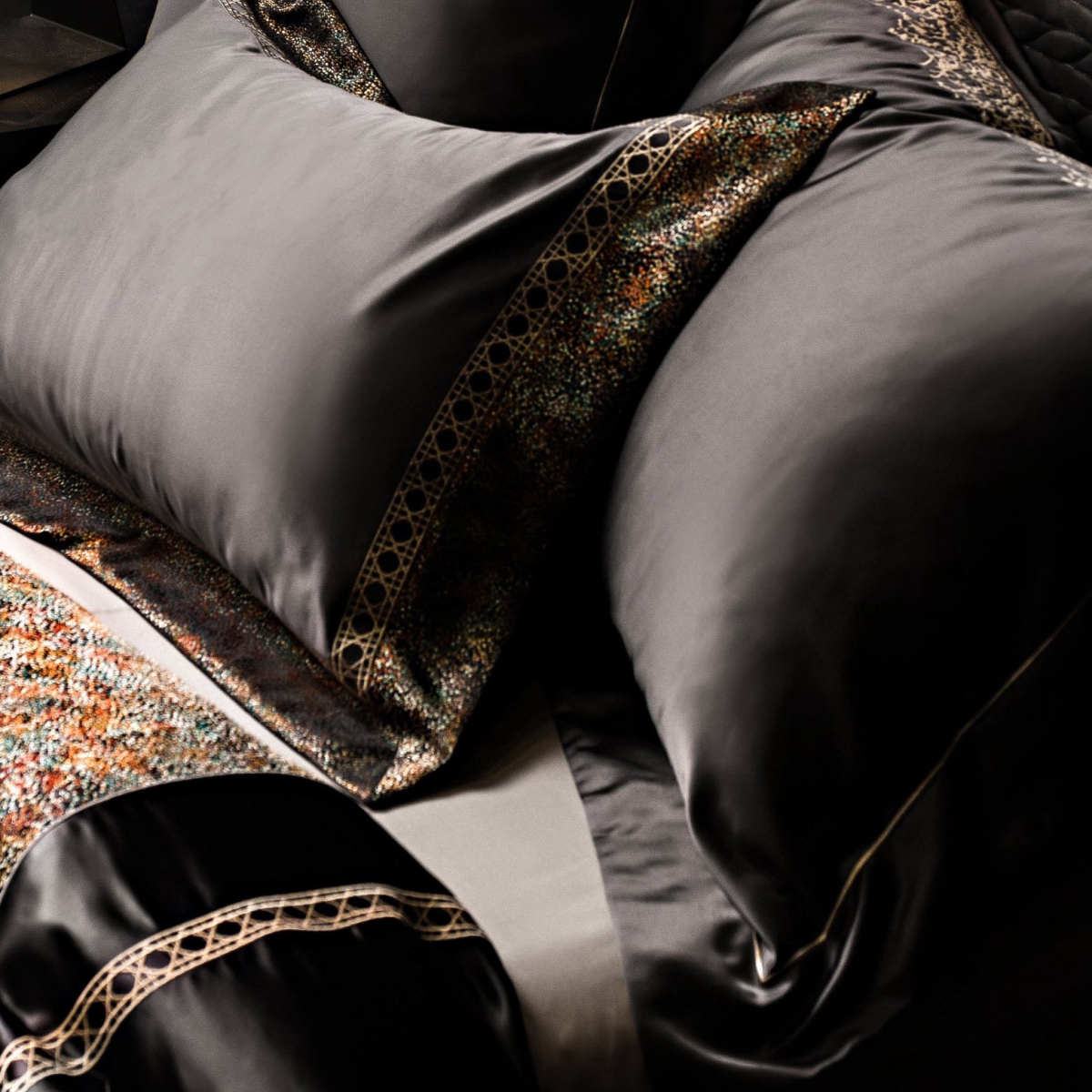 Кручёная нить придаёт материалу дополнительную прочность и создаёт эффект премиального сияния. Добавление шёлка усиливает тактильные ощущения: ткань остаётся прохладной на ощупь, но тёплой в объятиях, а её уникальная способность подстраиваться под тело делает отдых особенно комфортным.