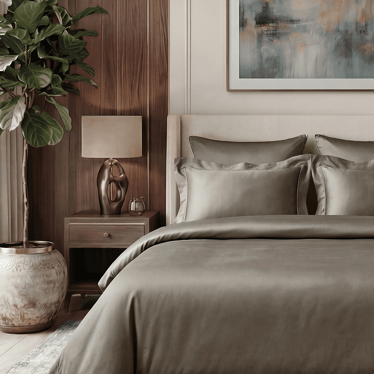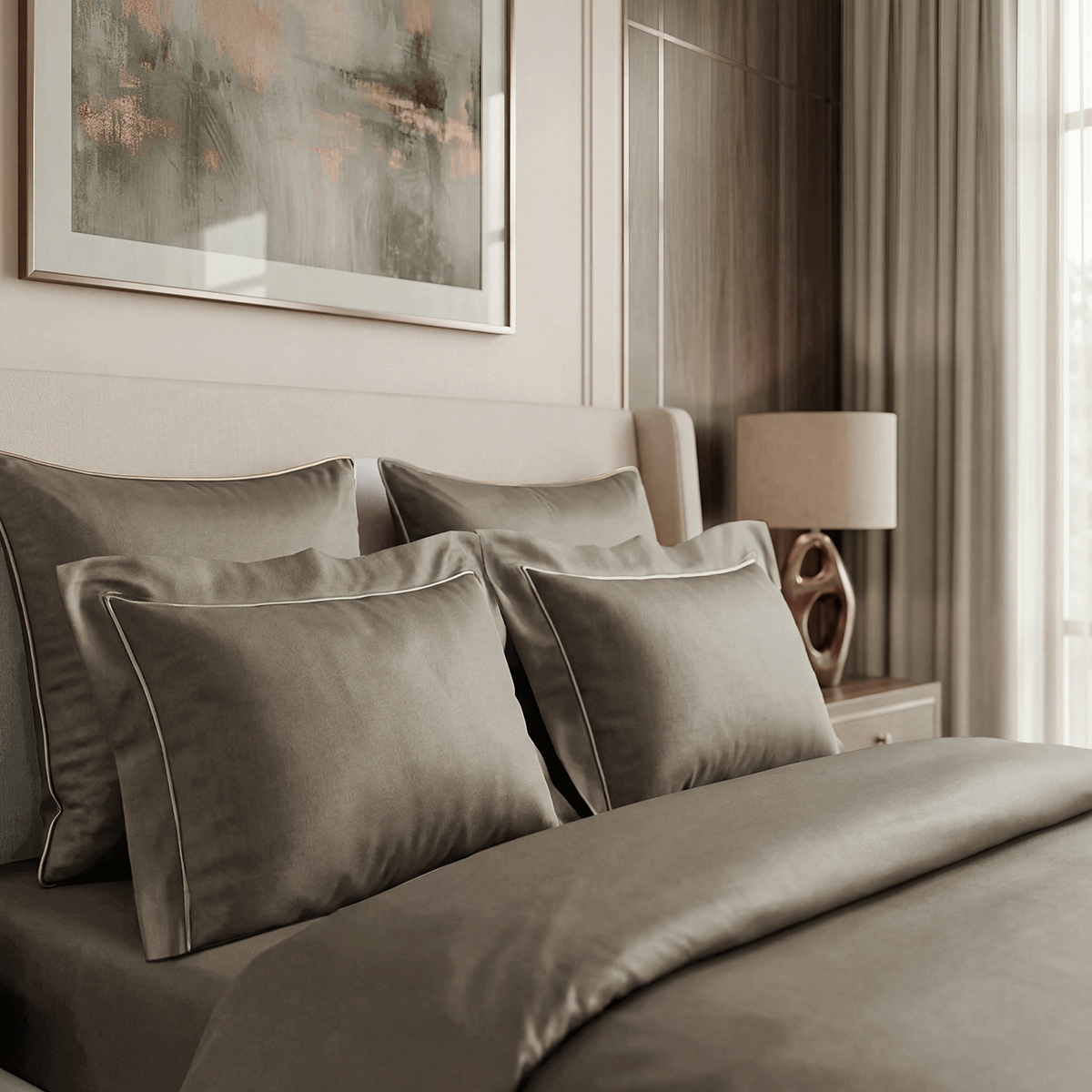 Редкий длинноволокнистый хлопок: нити прочнее и тоньше обычного, поэтому ткань не пиллингуется и не теряет форму. Сатиновое плетение создаёт живое сияние, как у шёлка, но с комфортом дышащего хлопка. Не электризуется, не скользит, приятен к телу. Выдерживает 500+ стирок без потери яркости и мягкости.