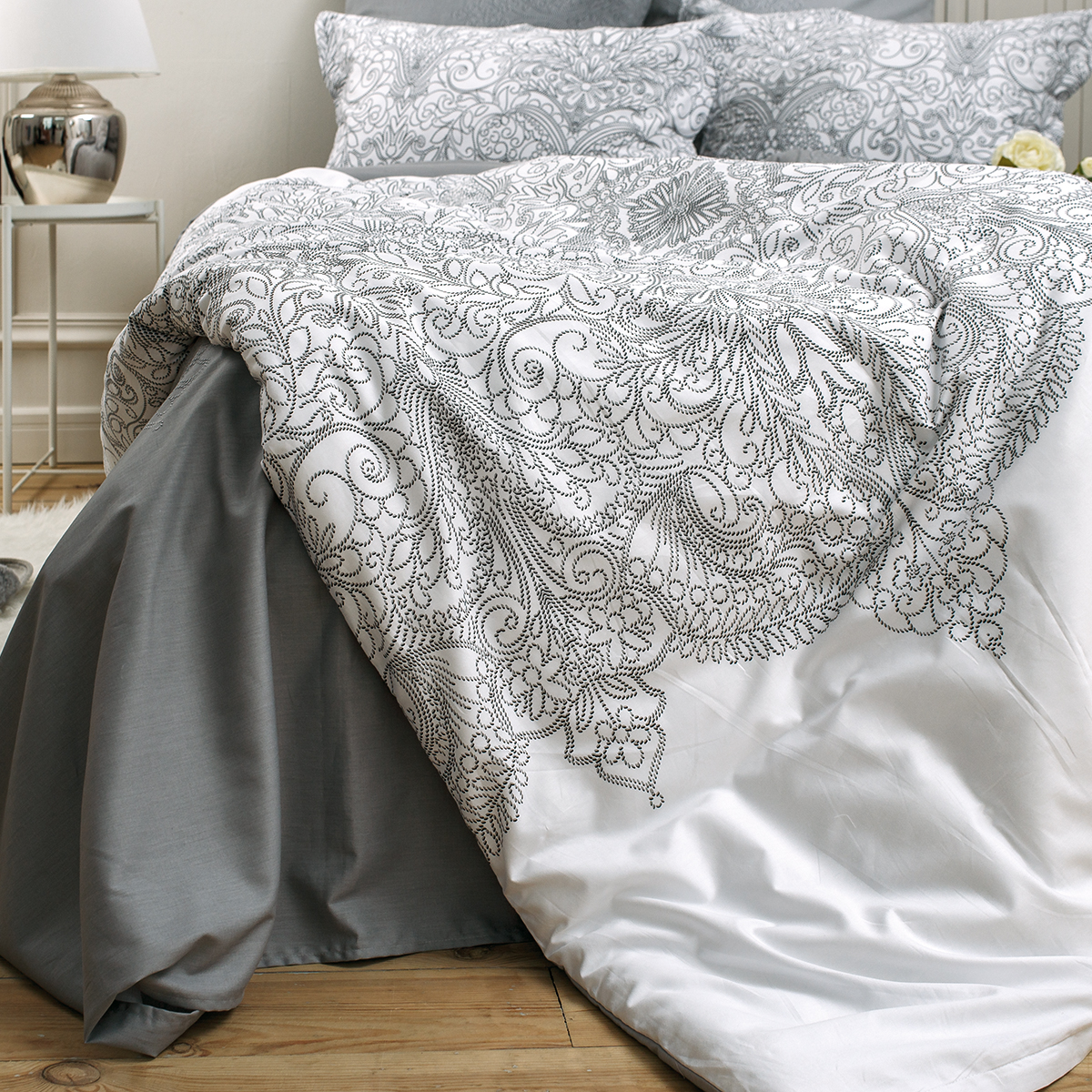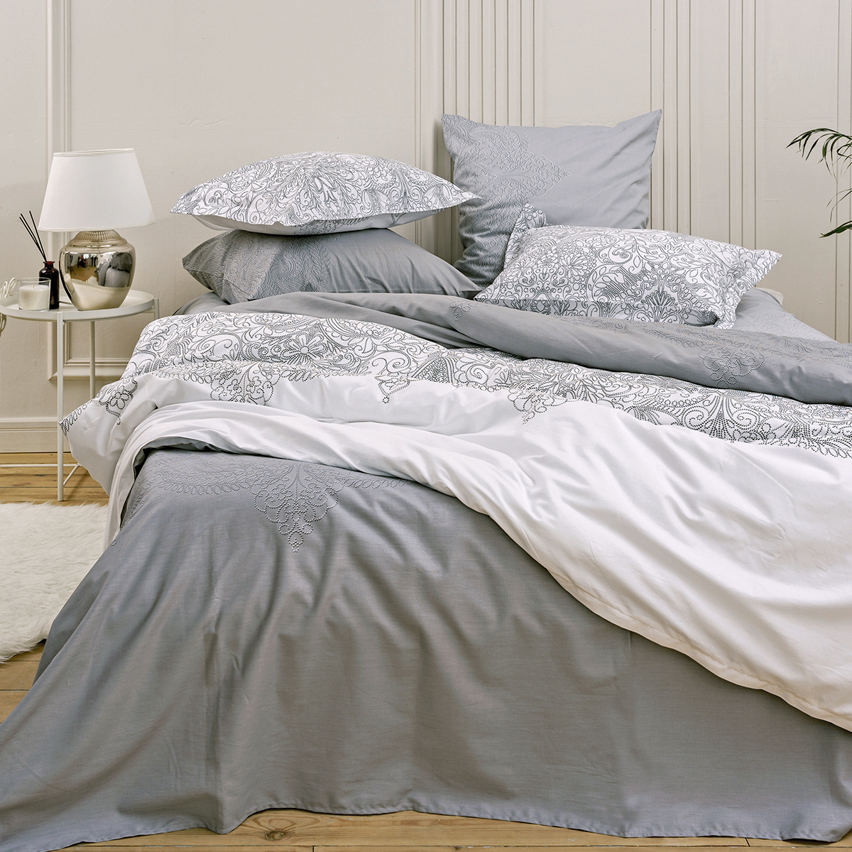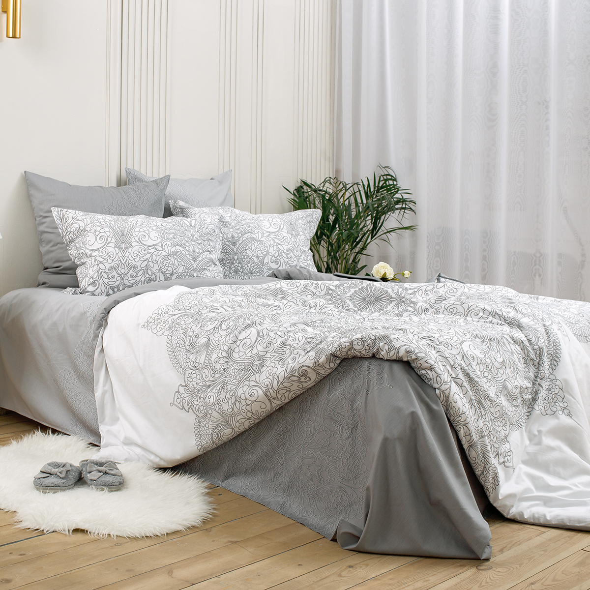 Сочетание двух монохромных оттенков и стильного, необычного орнамента превращает такое постельное белье в одновременно универсальное и изысканное украшение спальни. Наполняет пространство спокойствием, умиротворением и ощущением стабильности, смотрится нарядно и в тоже время сдержанно.