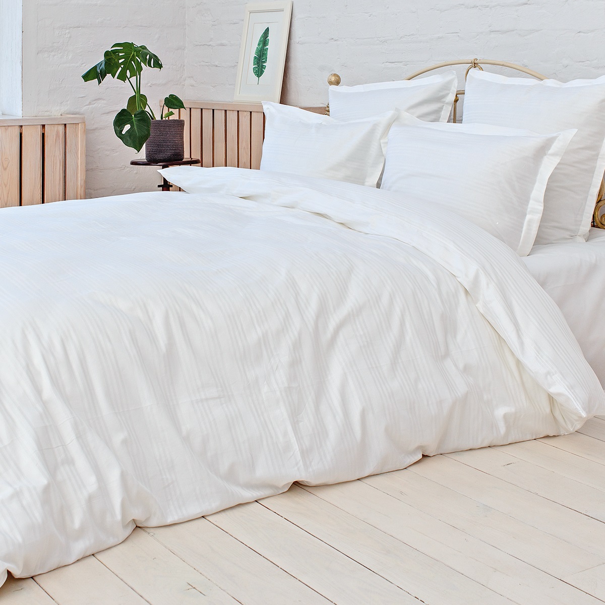 Однотонный стильный пододеяльник произведен из ткани страйп-сатин – 100% хлопок с жаккардовым рисунком в виде полос 3х3.