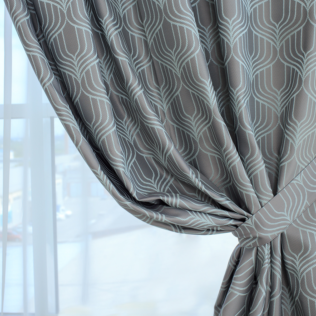 В комплект входят: портьеры 200х295 см – 2 шт., подхваты 8х70 см с петельками на концах – 2 шт.