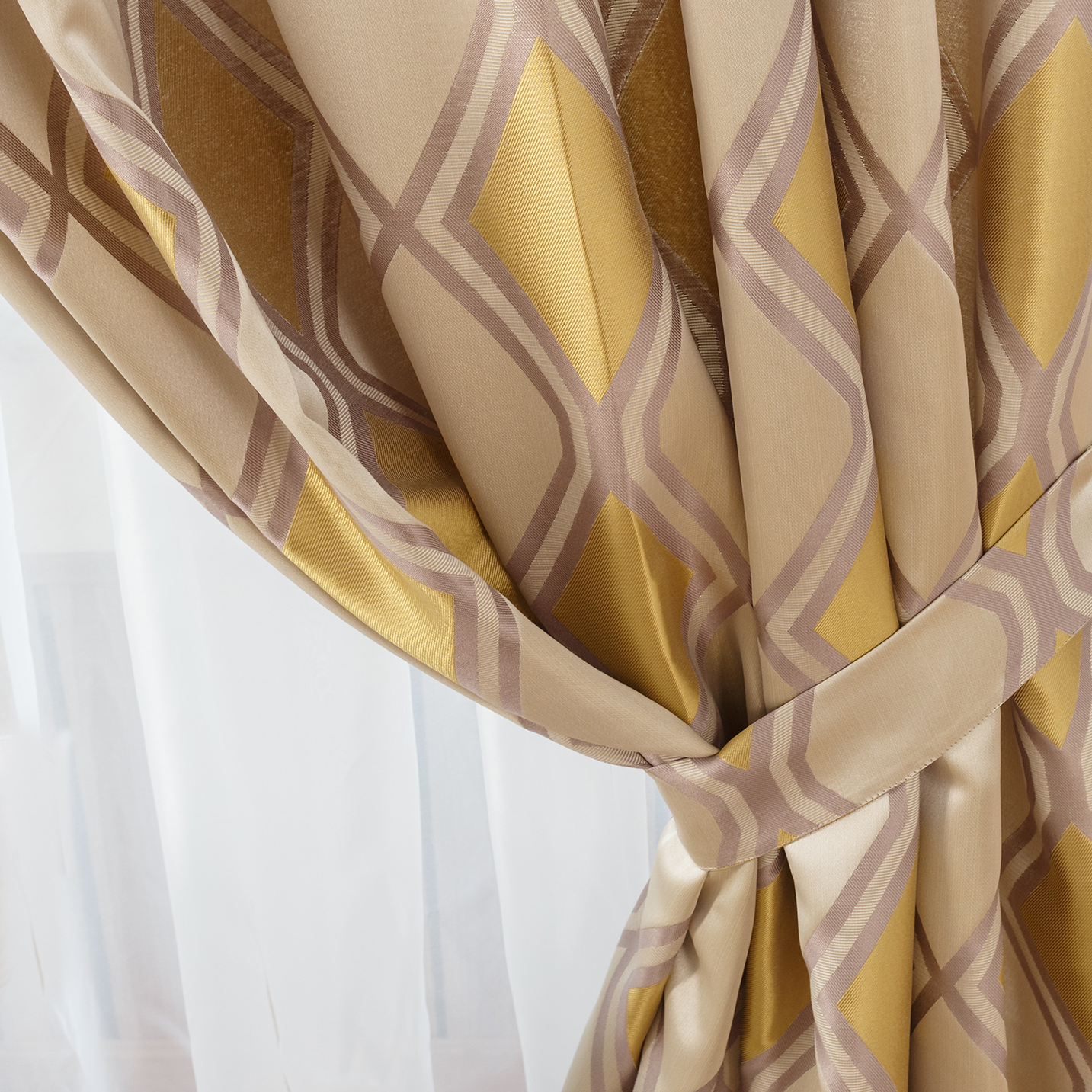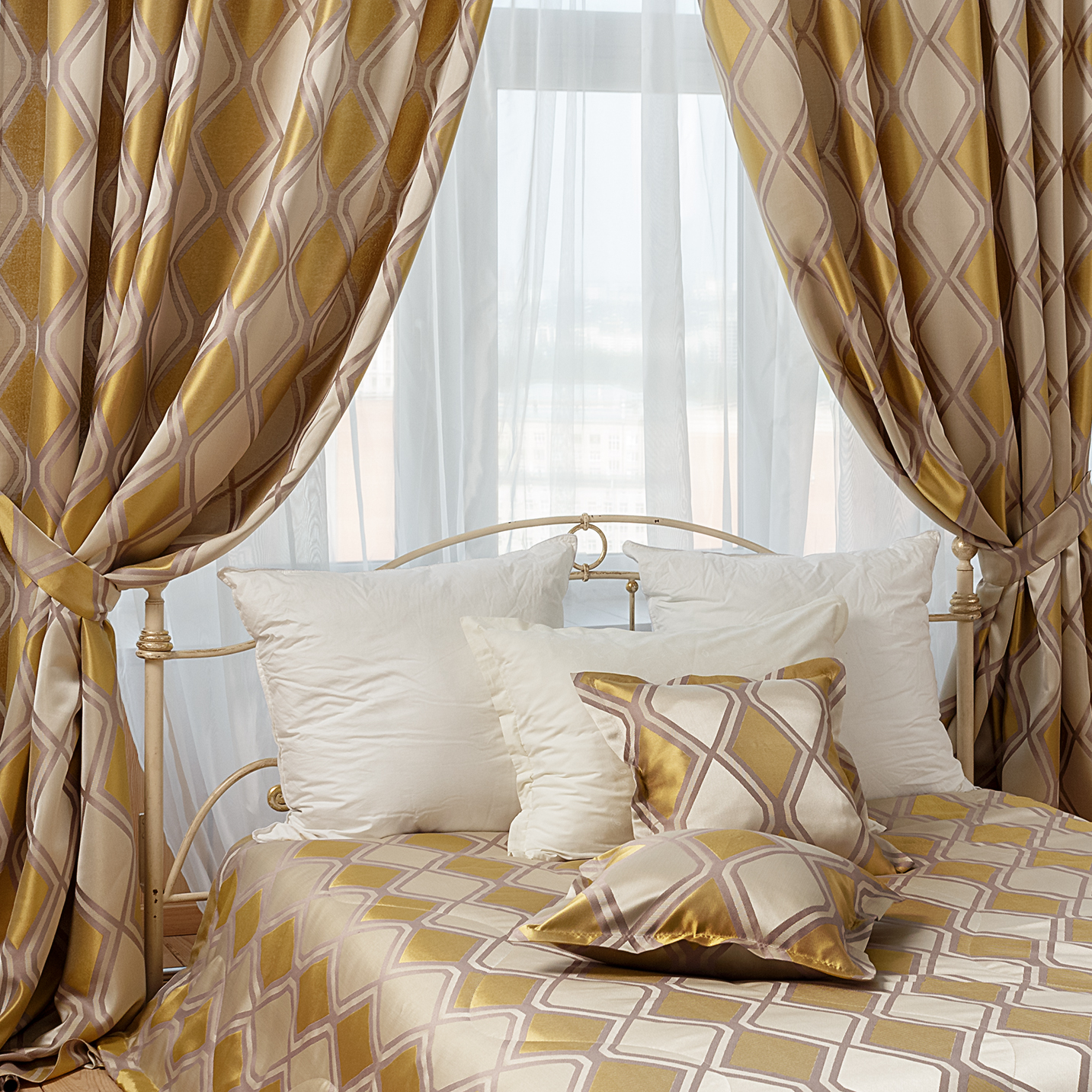 Коллекция «Робертино» выполнена в стиле ар-деко. Шторы выглядят намеренно дорого и элегантно, не кричаще роскошно, а просто ценно. Геометрический рисунок в виде ромбов горчичного цвета выгодно подчеркивает сияющий светло бежевый фон. Контраст цветов выгодно подчеркнет и оживит интерьер любой комнаты.