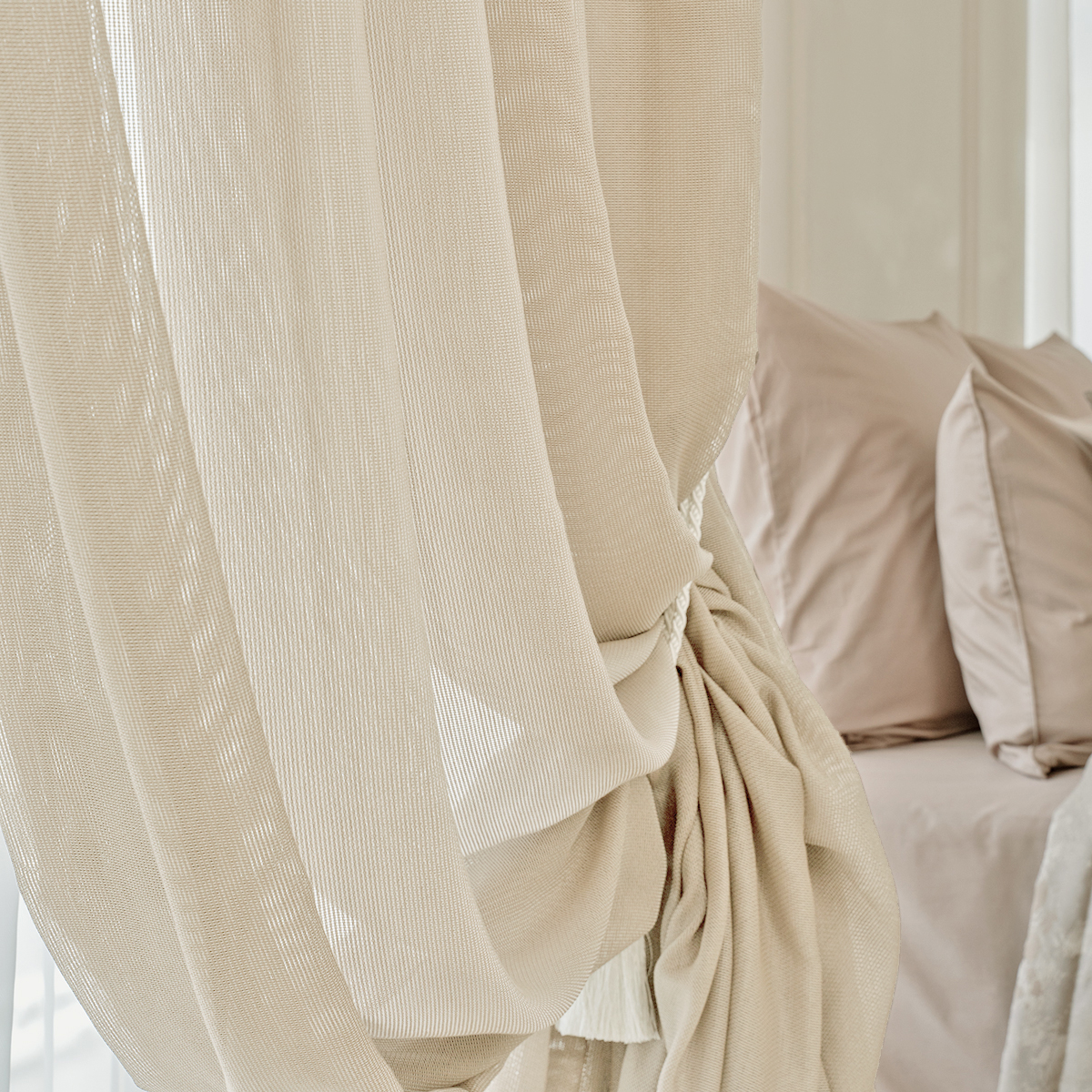 Вуаль — это мягкая полупрозрачная ткань, нити которой менее плотные по сравнению с органзой. Она пропускает меньше света и прекрасно драпируется. Современная вуаль изготавливается в основном из полиэстера с добавлением хлопка или вискозы. Материал из натуральных волокон обладает меньшей прочностью, требует более осторожного ухода и стоит дороже.